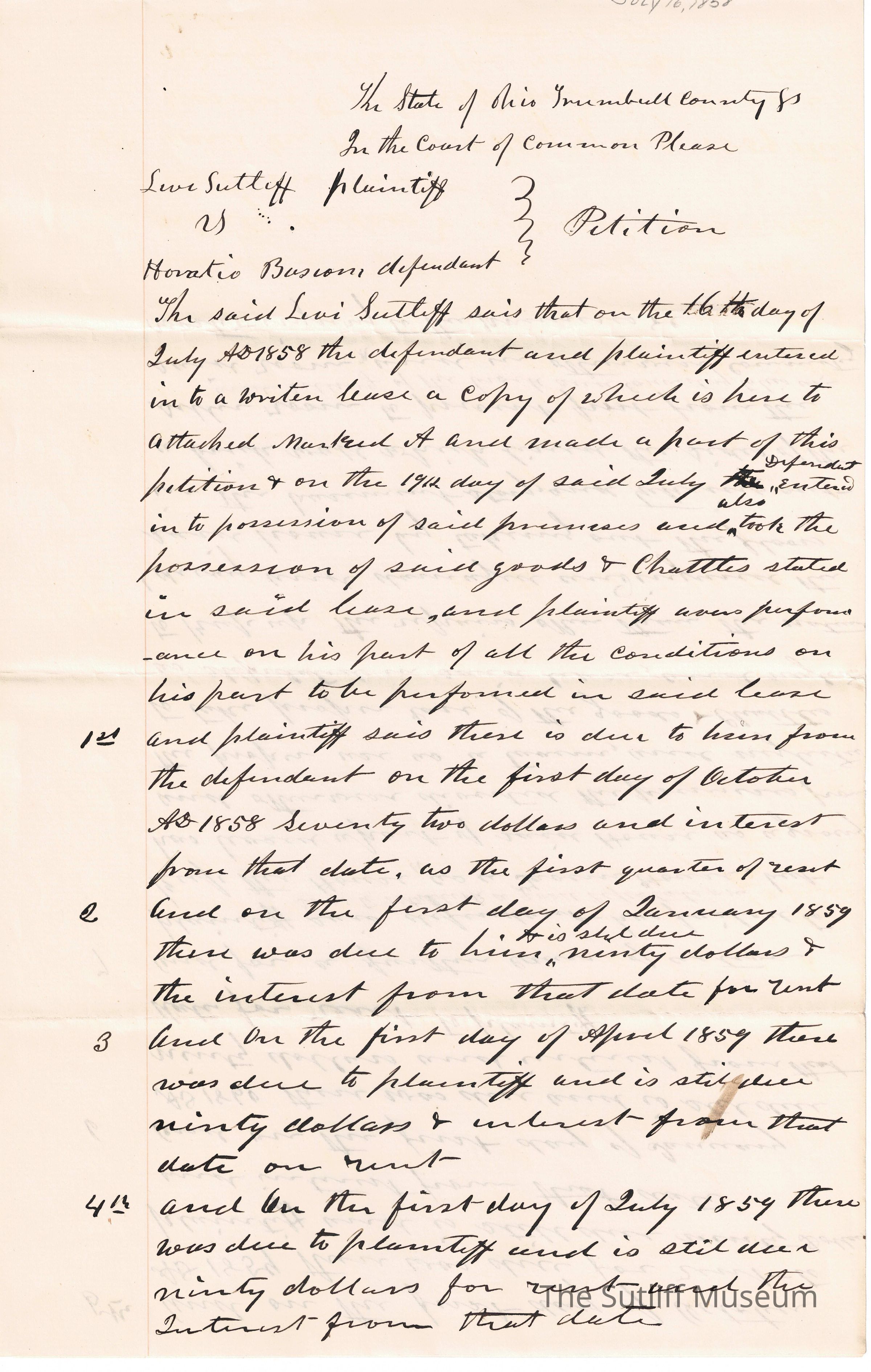 This is a record the legal case of Levi Sutliff vs Horatio Bascom regarding the money owed for various charges. Duplicate of the transcript.Relationships