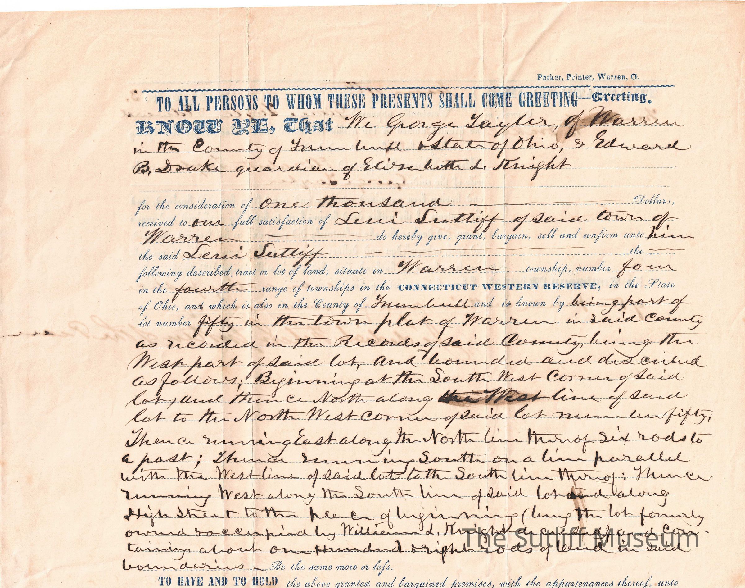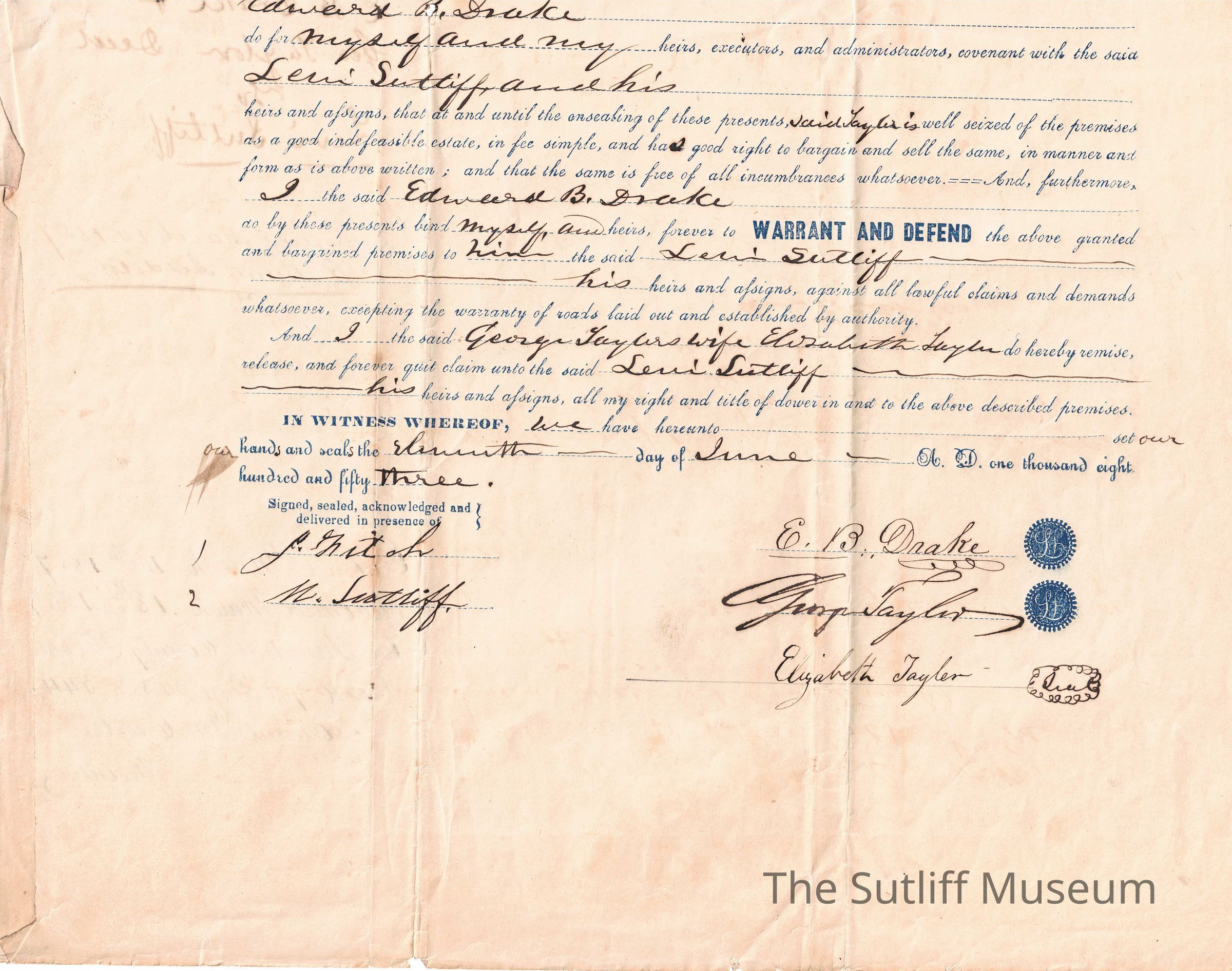 A legal document regarding the deed of land from George Taylor and Edward B. Drake, guardian of Elizabeth Taylor, to Levi Sutliff.Relationships