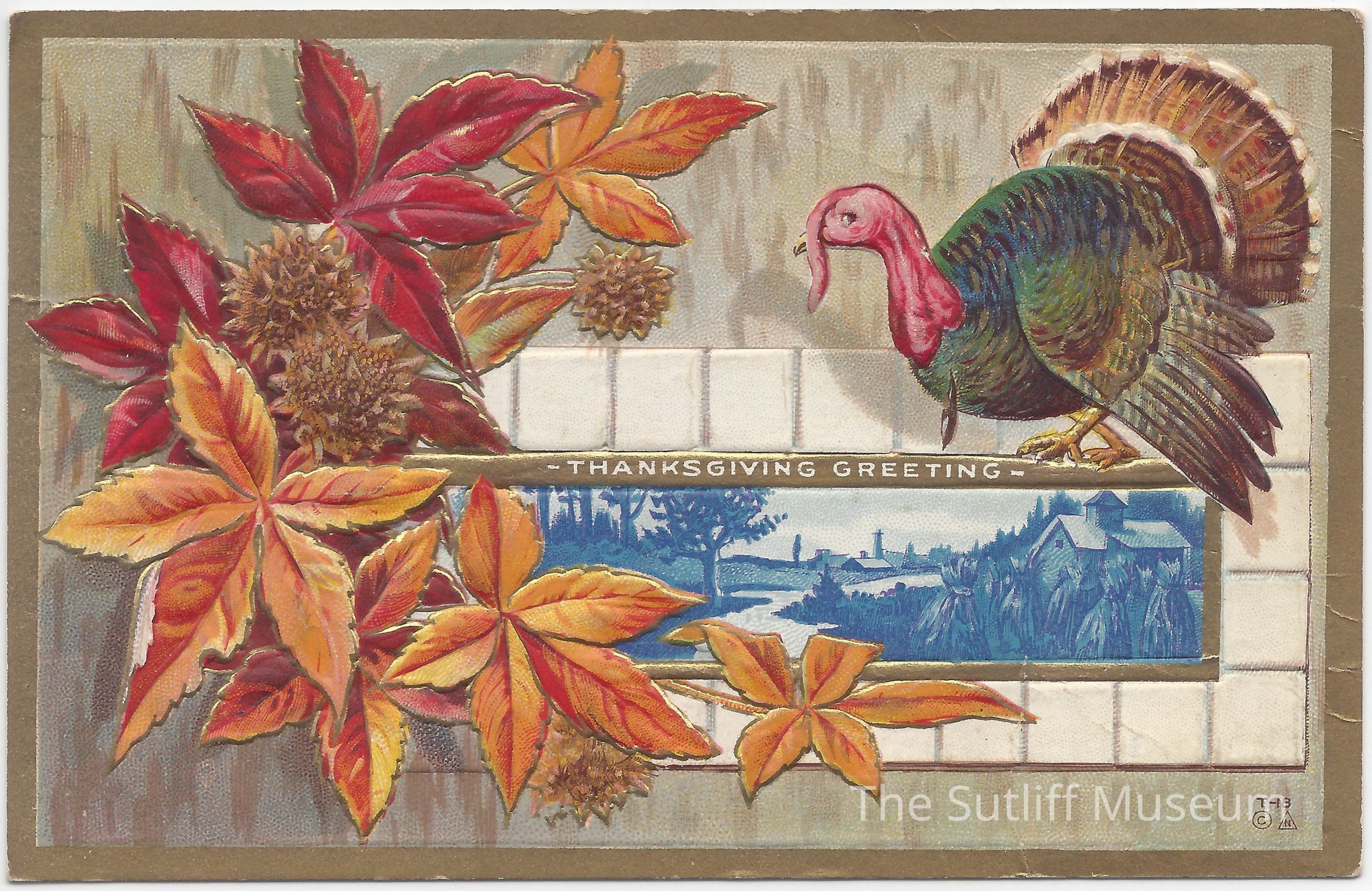 Thanksgiving postcard that depicts a turkey with a orange leaves on a window with the saying "Thanksgiving Greeting" in the middle.