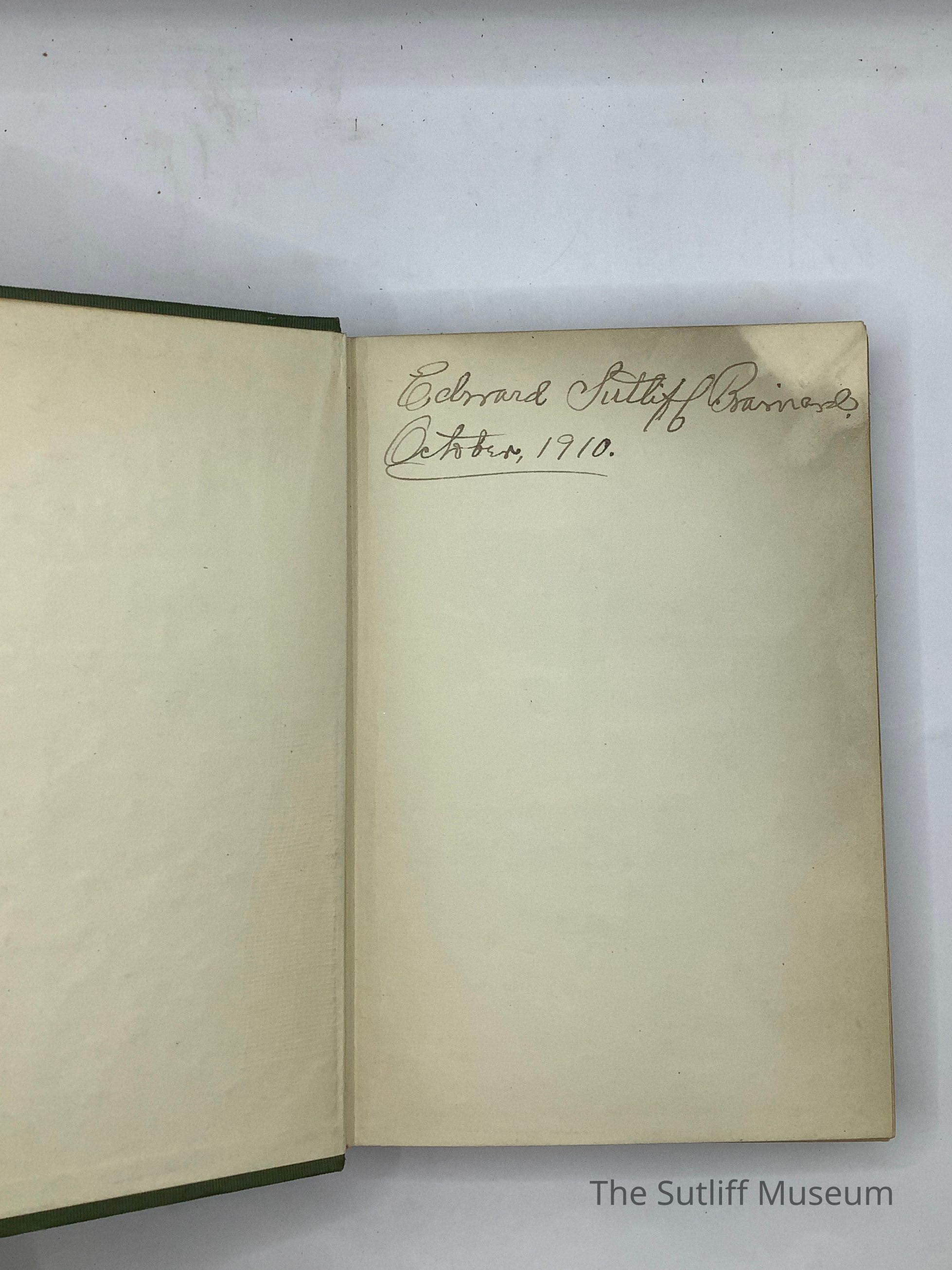Green leather bound gold text in square border with green blind finishing vegetative pattern. Handwritten inscription on frontpiece: "Edward Sutliff Brainard. October, 1910."