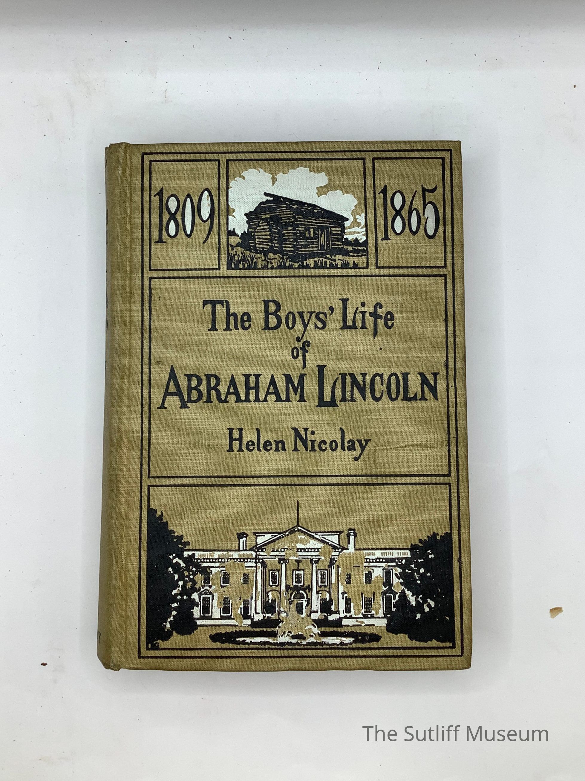 Drap yellow hardbound copy of "The Boys' Life of Abraham Lincoln" by Helen Nicolay. Front cover has an image of the White House in bottom frame, title in center frame, and the dates 1809 1865 with image of log cabin in top frame, bordered in black. Handwritten on first page "Edward S. Barinard Dec. 25, 1910 Edward S. Brainard Lawrenceville School 2/16/15"