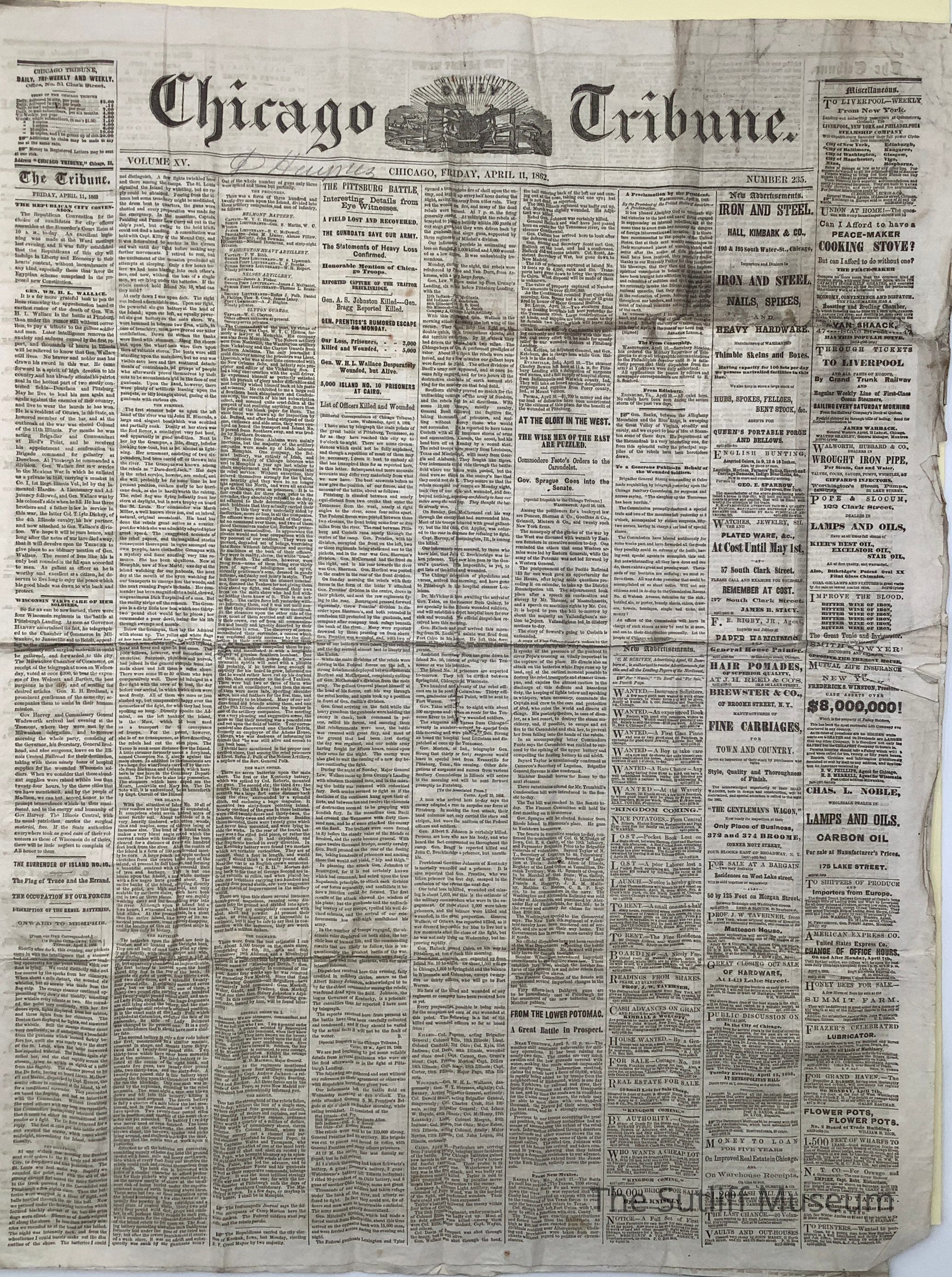 The Chicago Tribune newspaper, published April 11, 1862.Collection
