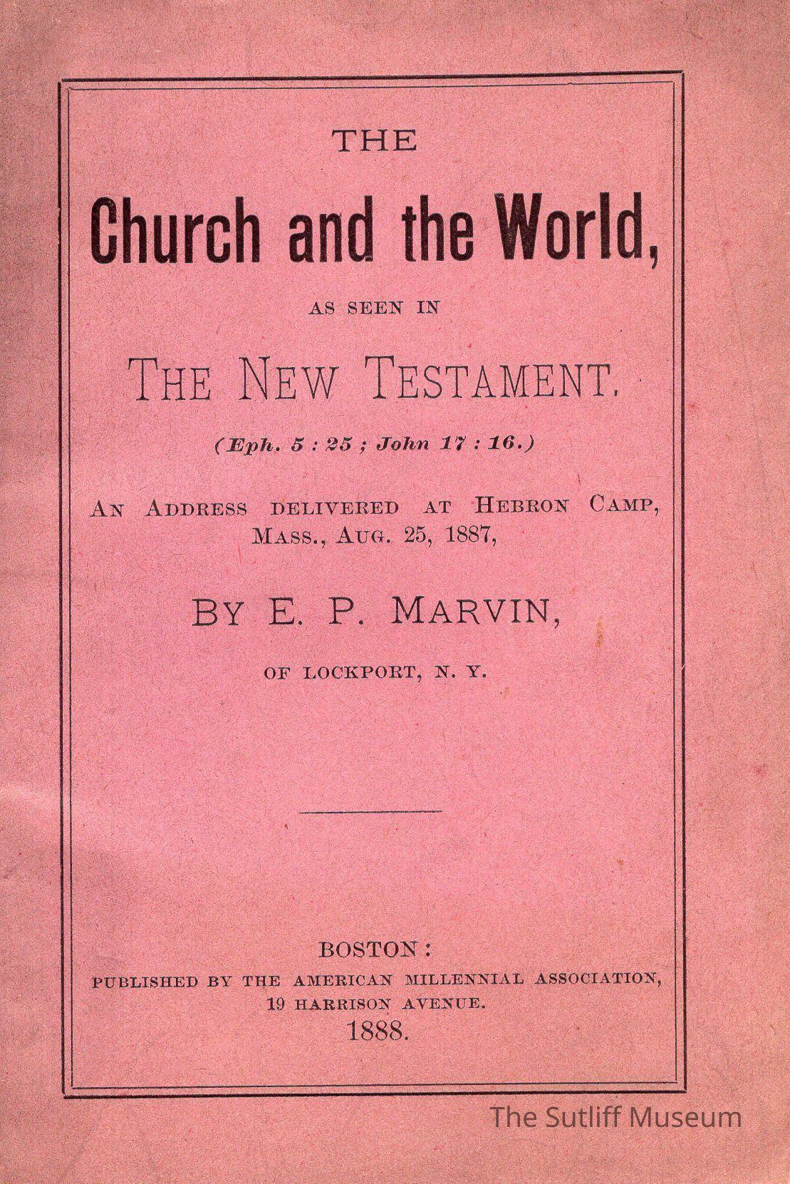 The Church and the World as seen in The New Testament delivered by E. P. Marvin on August 25, 1887. Booklet contains information on the role of the church within the world as seen in The New Testament. The back cover has a verse titled "The Difference"