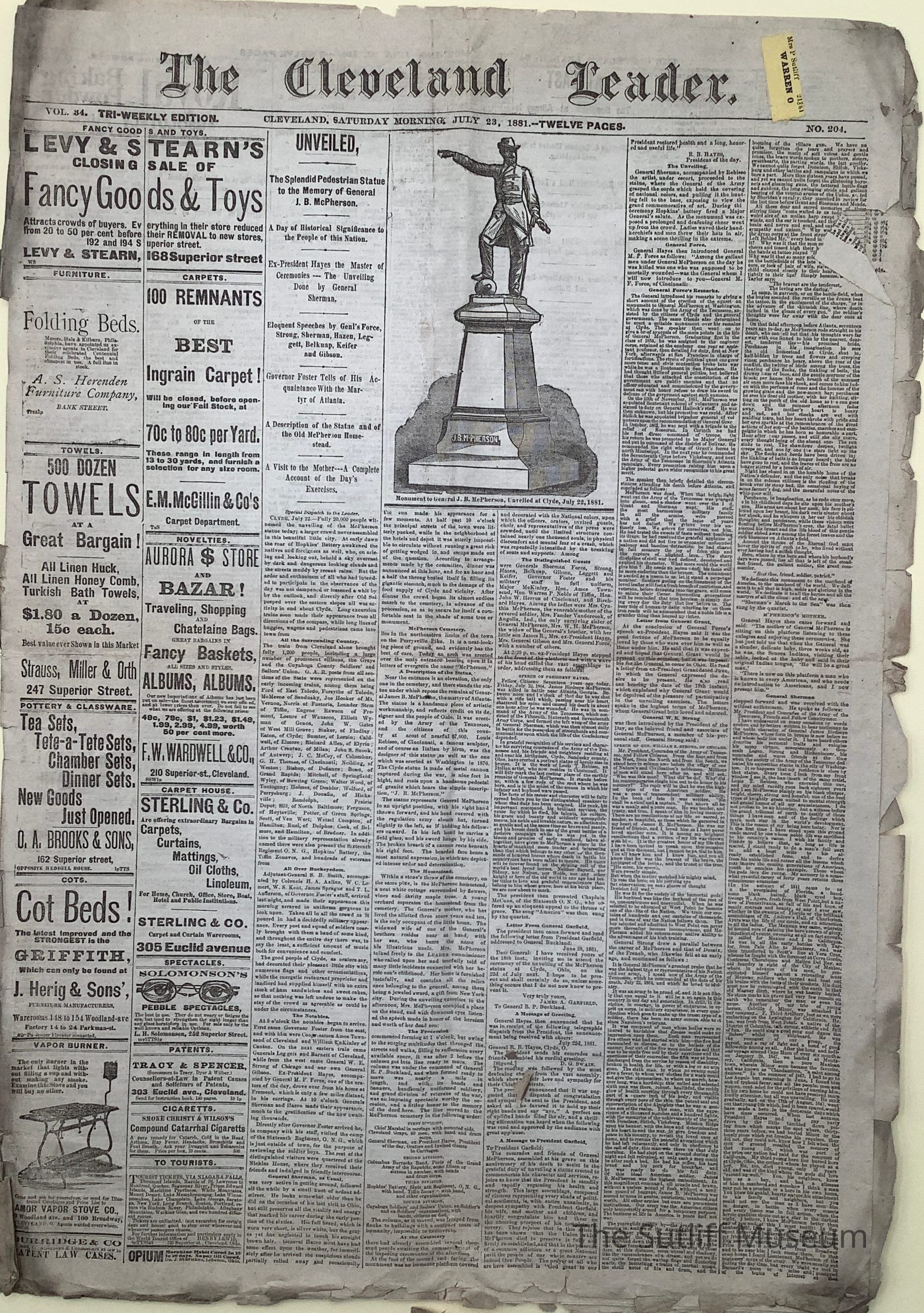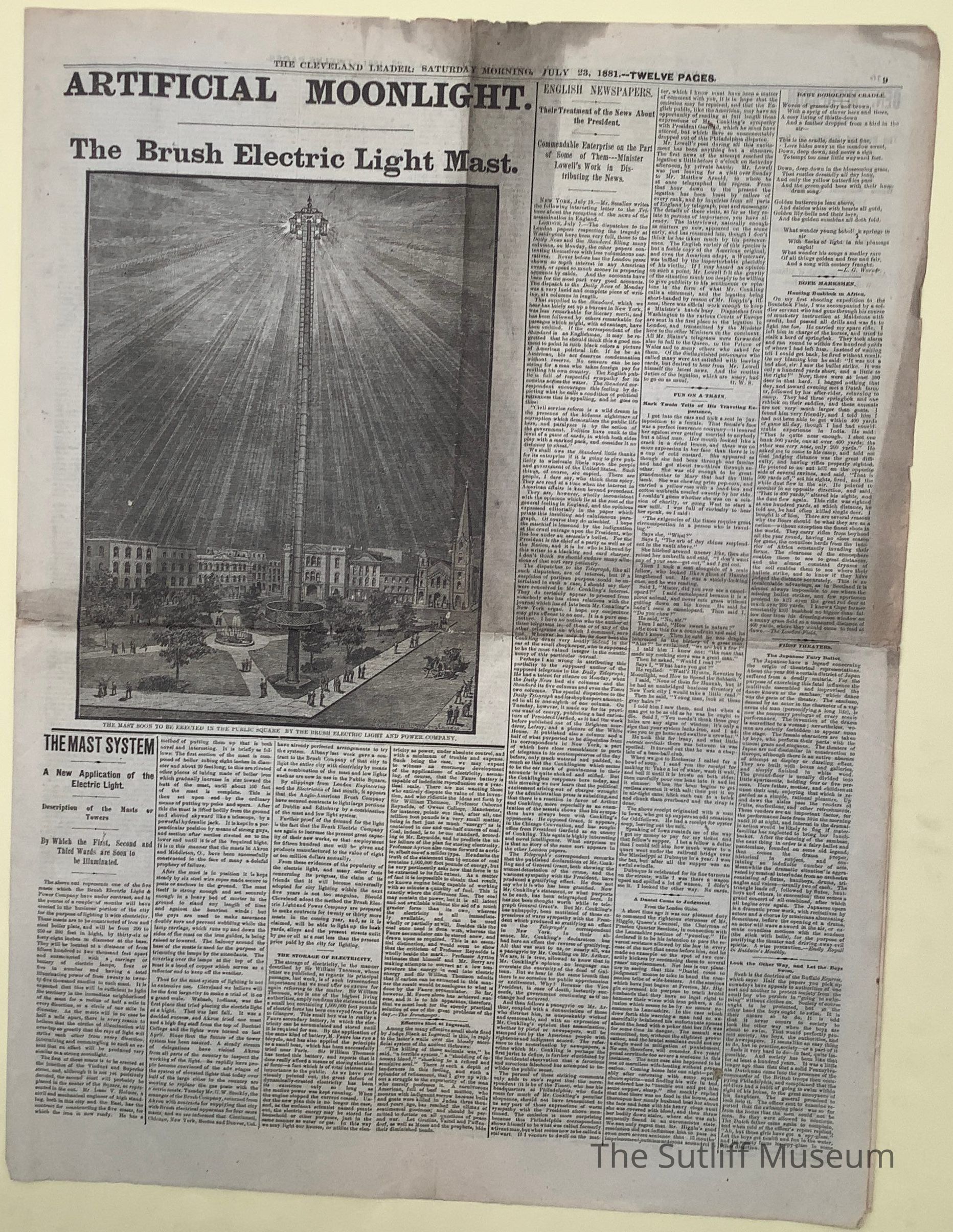 The Cleveland Leader newspaper, published July 23, 1881.Collection