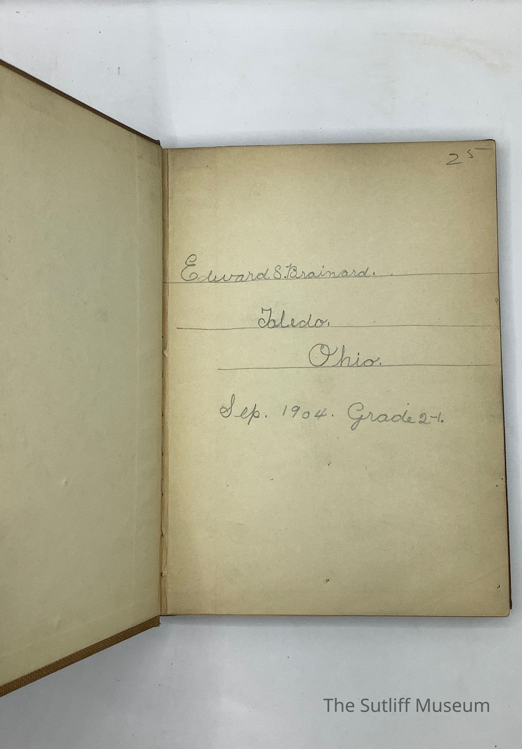 Tan cloth Hardcover book with brown text and floral images. Handwritten inscription reading:"Edward S. Brainard Toledo, Ohio Sep. 1904 Grades 2-1"