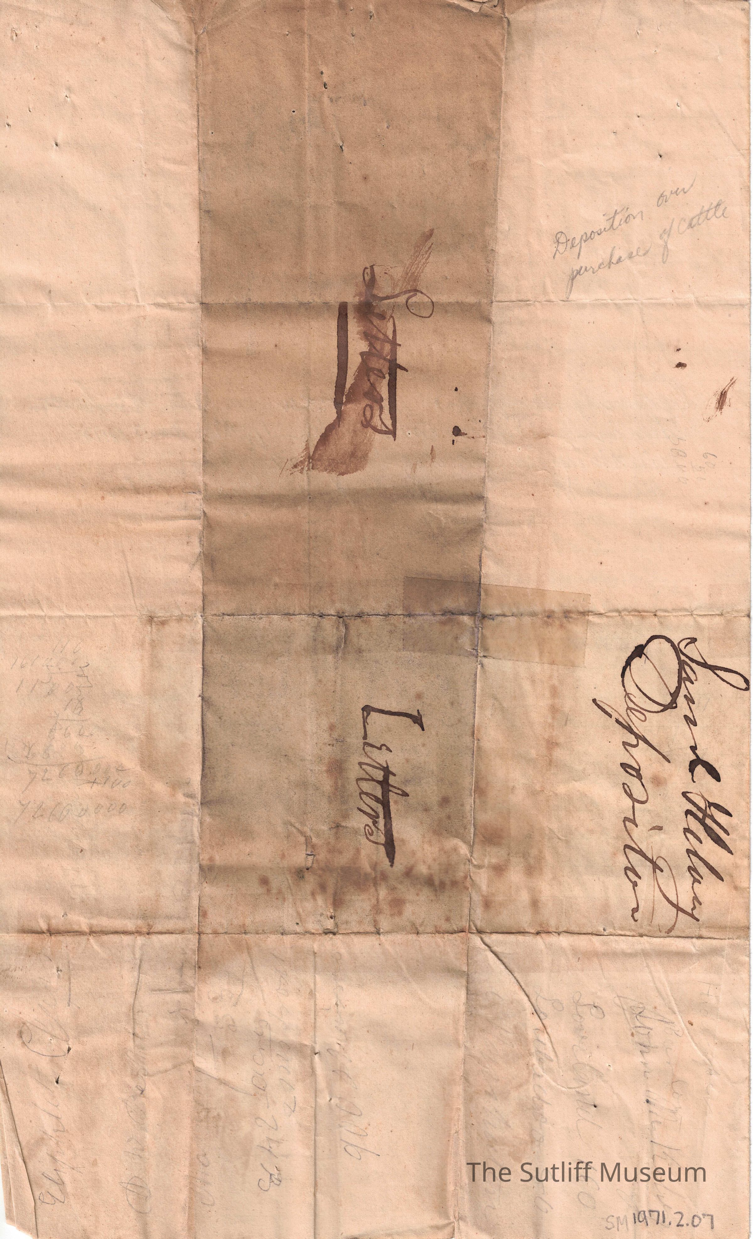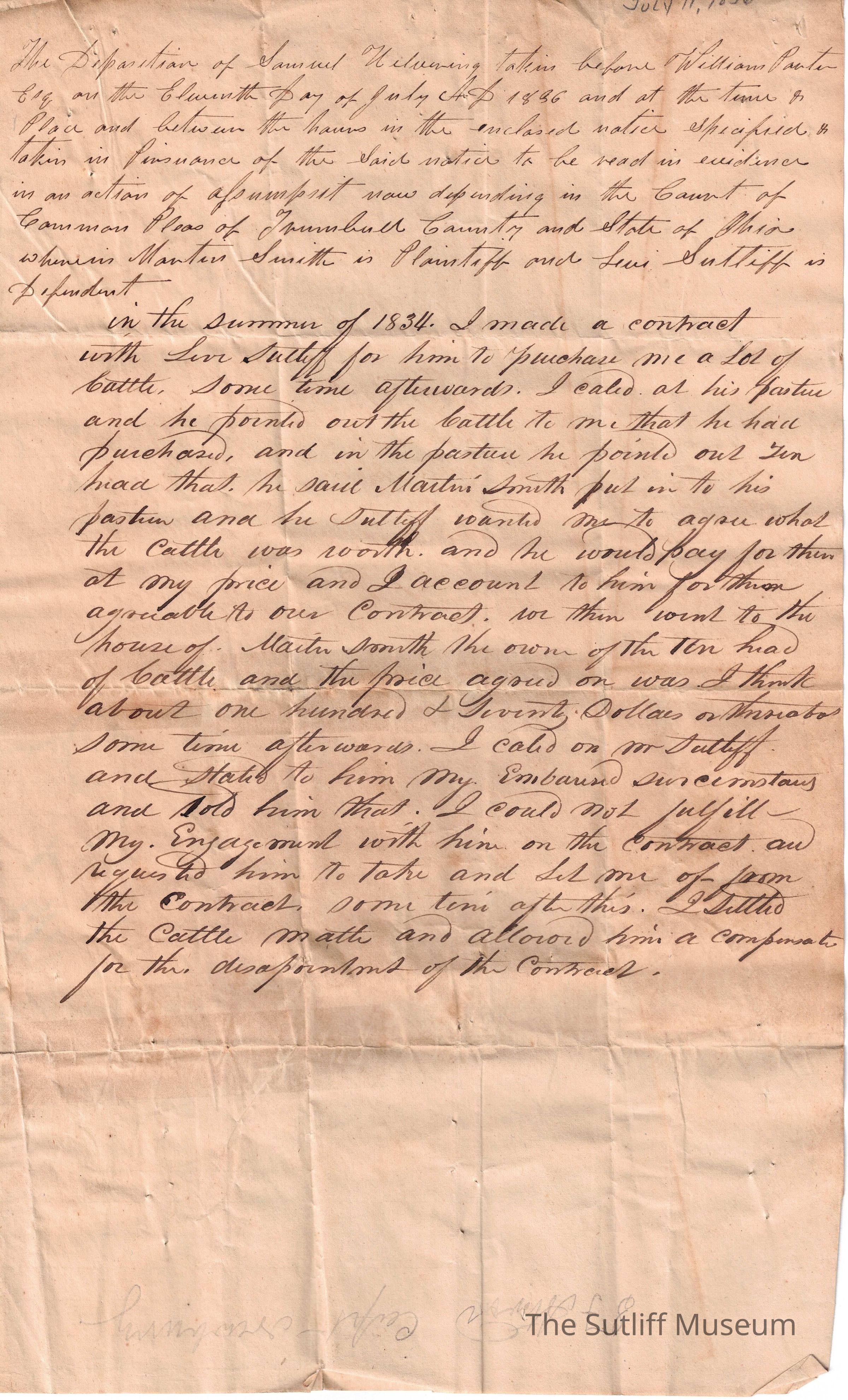 A letter regarding a contract made between Samuel Helvering and Levi Sutliff to acquire Helvering a lot of cattle and his inability to fulfil the contract.Collection