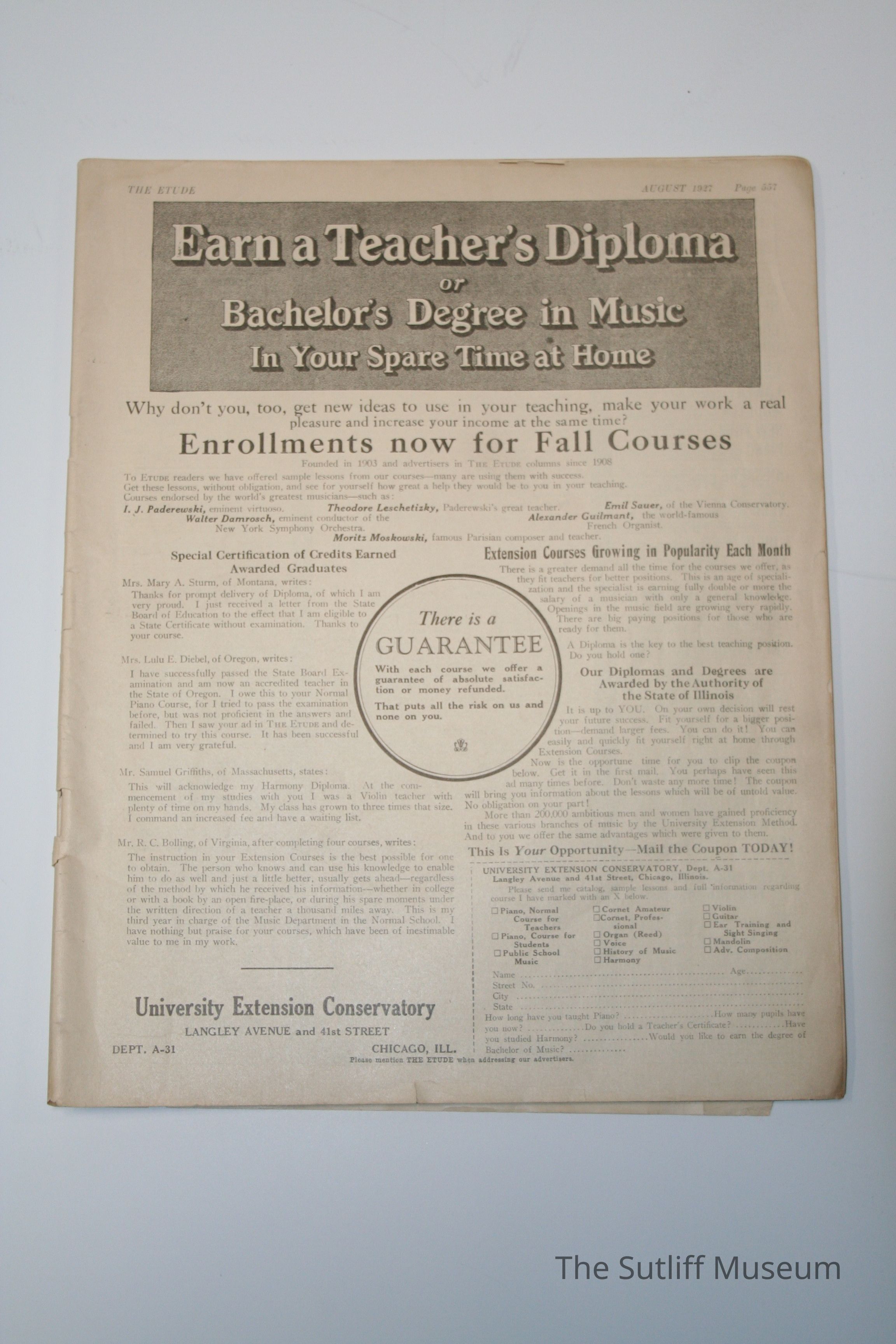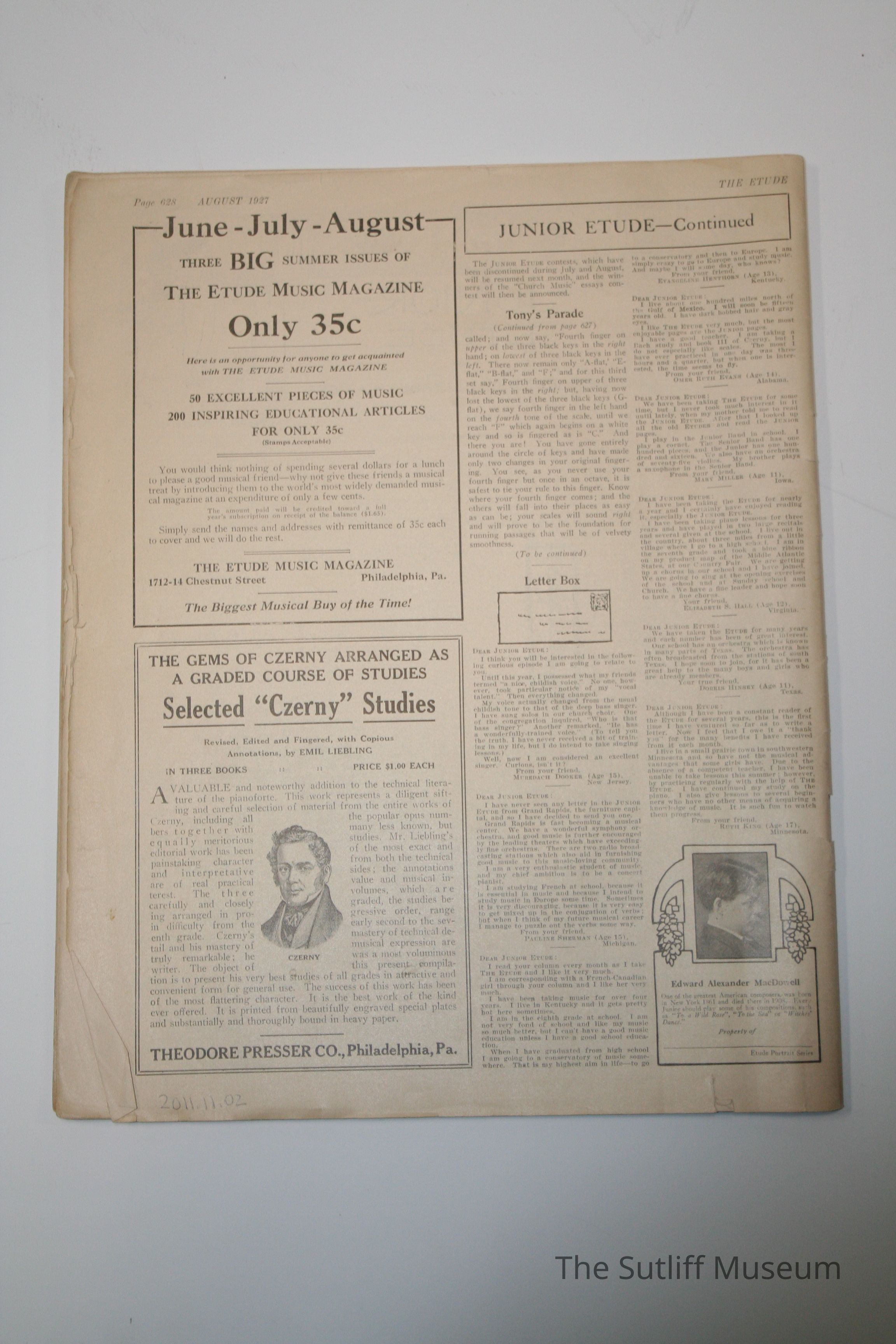 The Etude Magazine from August 1927 15.75 x 11 Paper with black ink