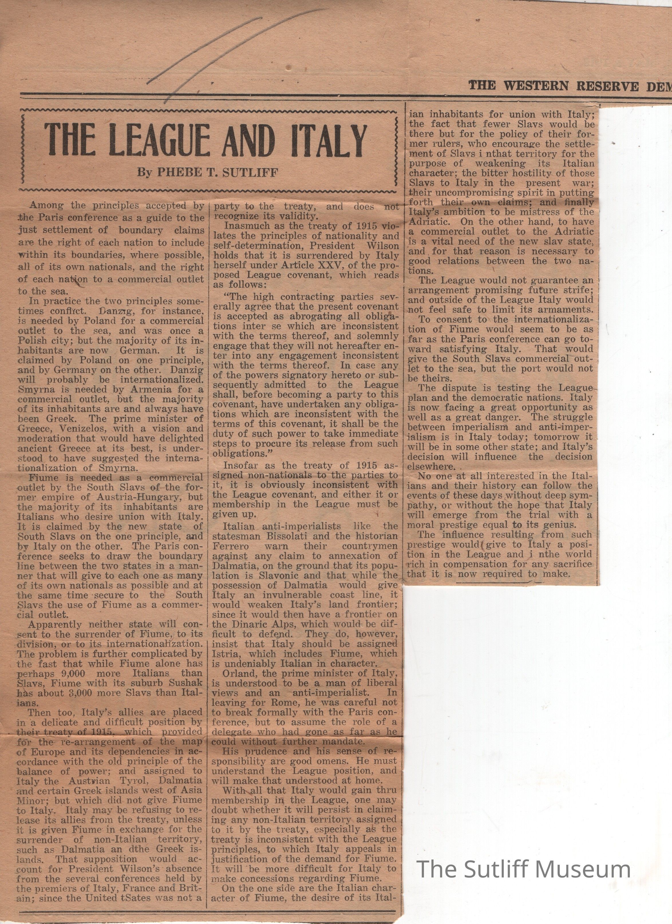 An article titled "The League and Italy" by Phebe T. Sutliff. Dated 5/8/1919Collection