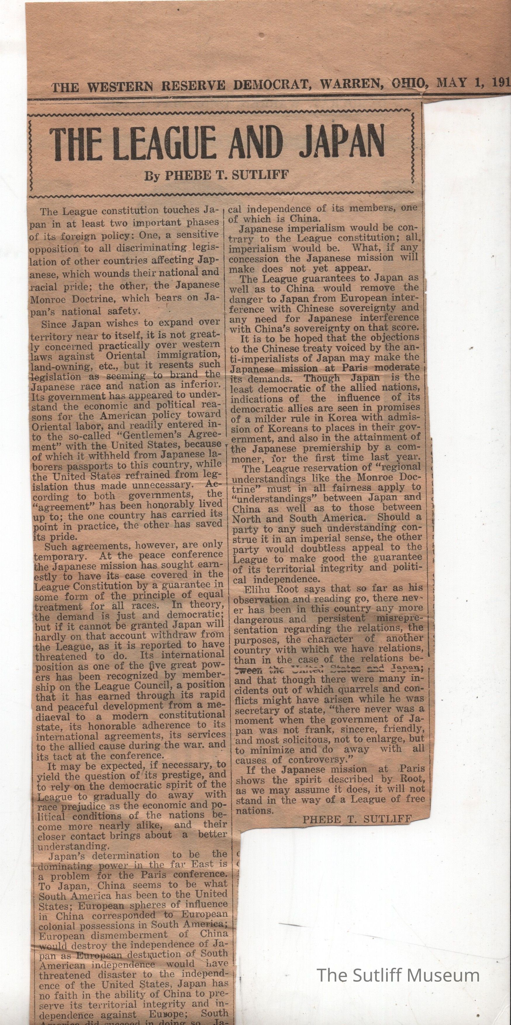 An article titled "The League And Japan" by Phebe T. Sutliff. Dated 5/1/1919Collection