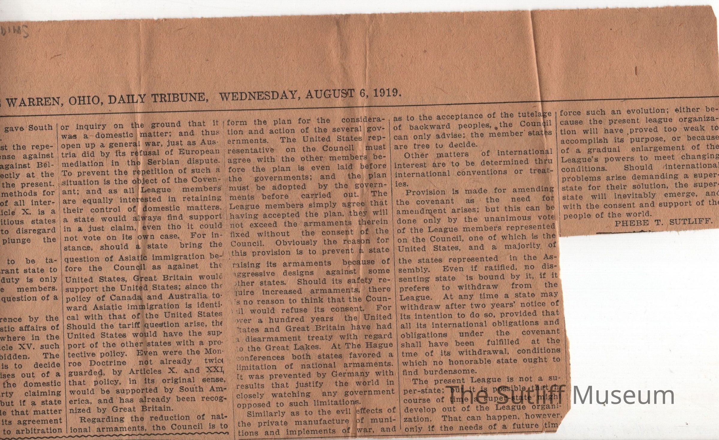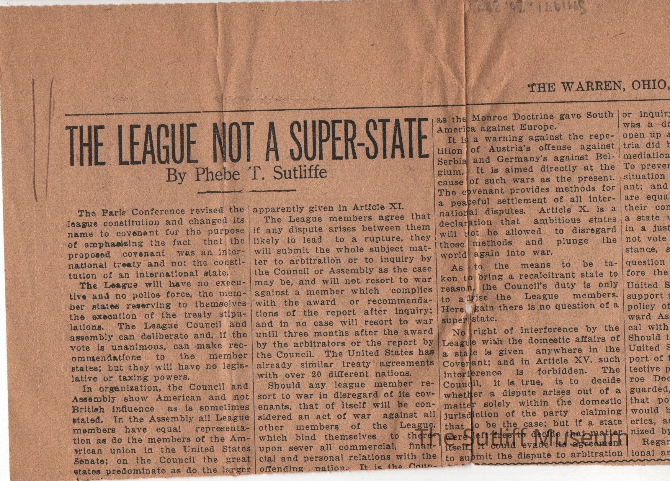 An article titled "The League Not a Super-State" by Phebe T. Sutliff. Dated 8/6/1919.Collection