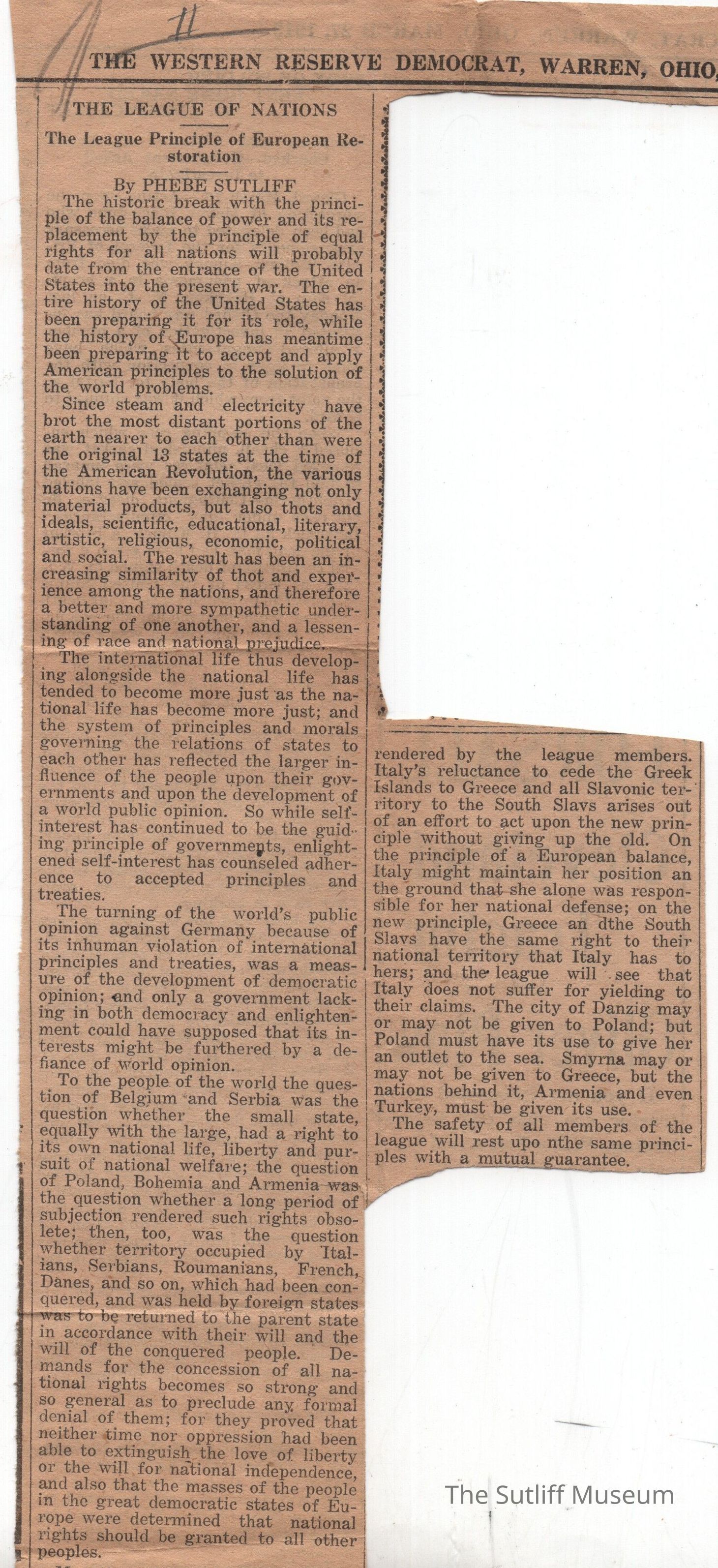 An article titled "The League of Nations" by Phebe T. Sutliff Dated 3/27/1919Collection