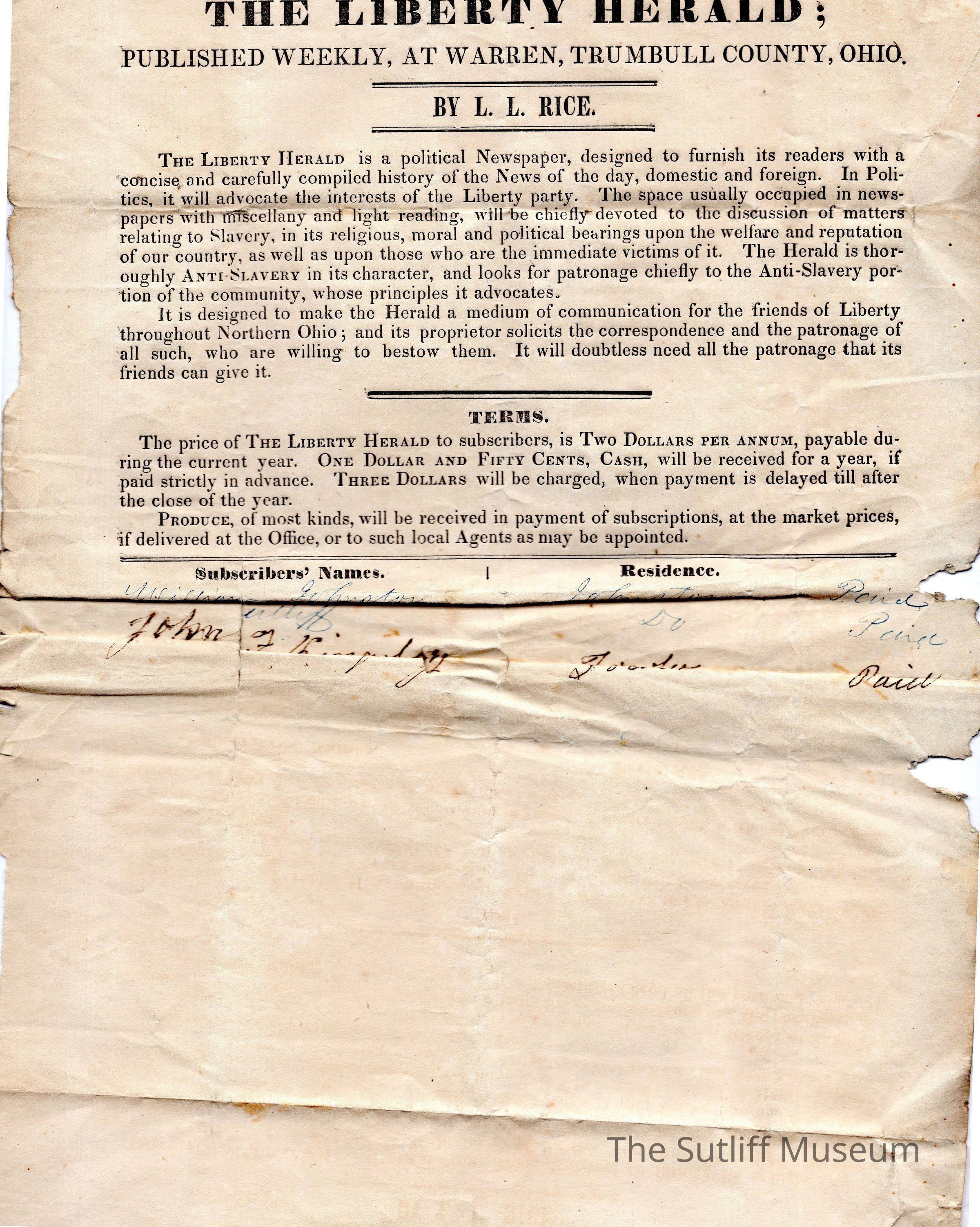 A subscription to "The Liberty Herald" published weekly in Warren, Ohio. It is signed by William Johnston, Levi Sutliff, and John F. Kingsley.Collection