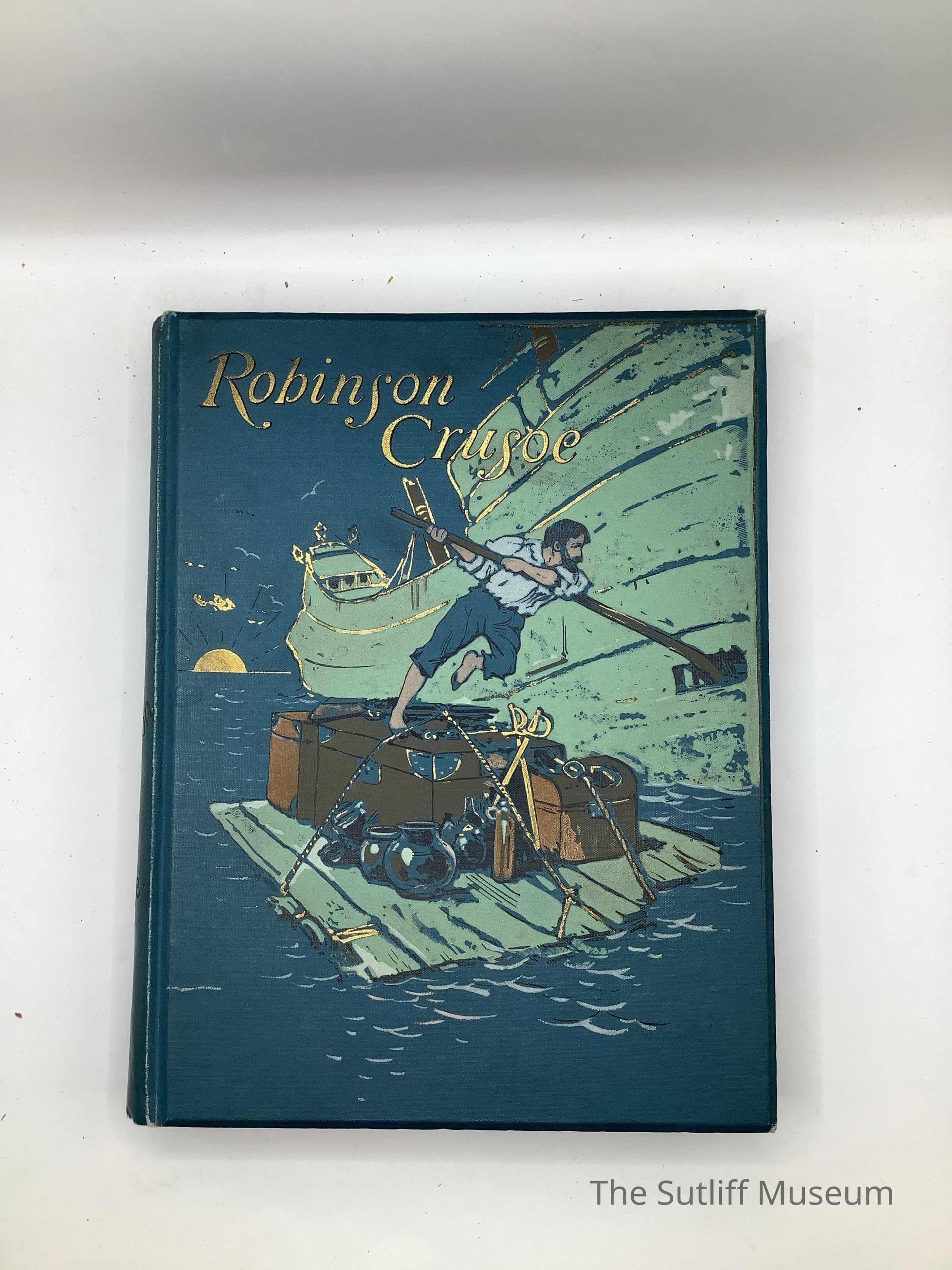 Blue cloth hard bound copy with full color illustration embossed on front cover of ship, raft and Robinson Crusoe. 328 pages with illustrations.9.25 inches high X 7 inches wide.Collection
