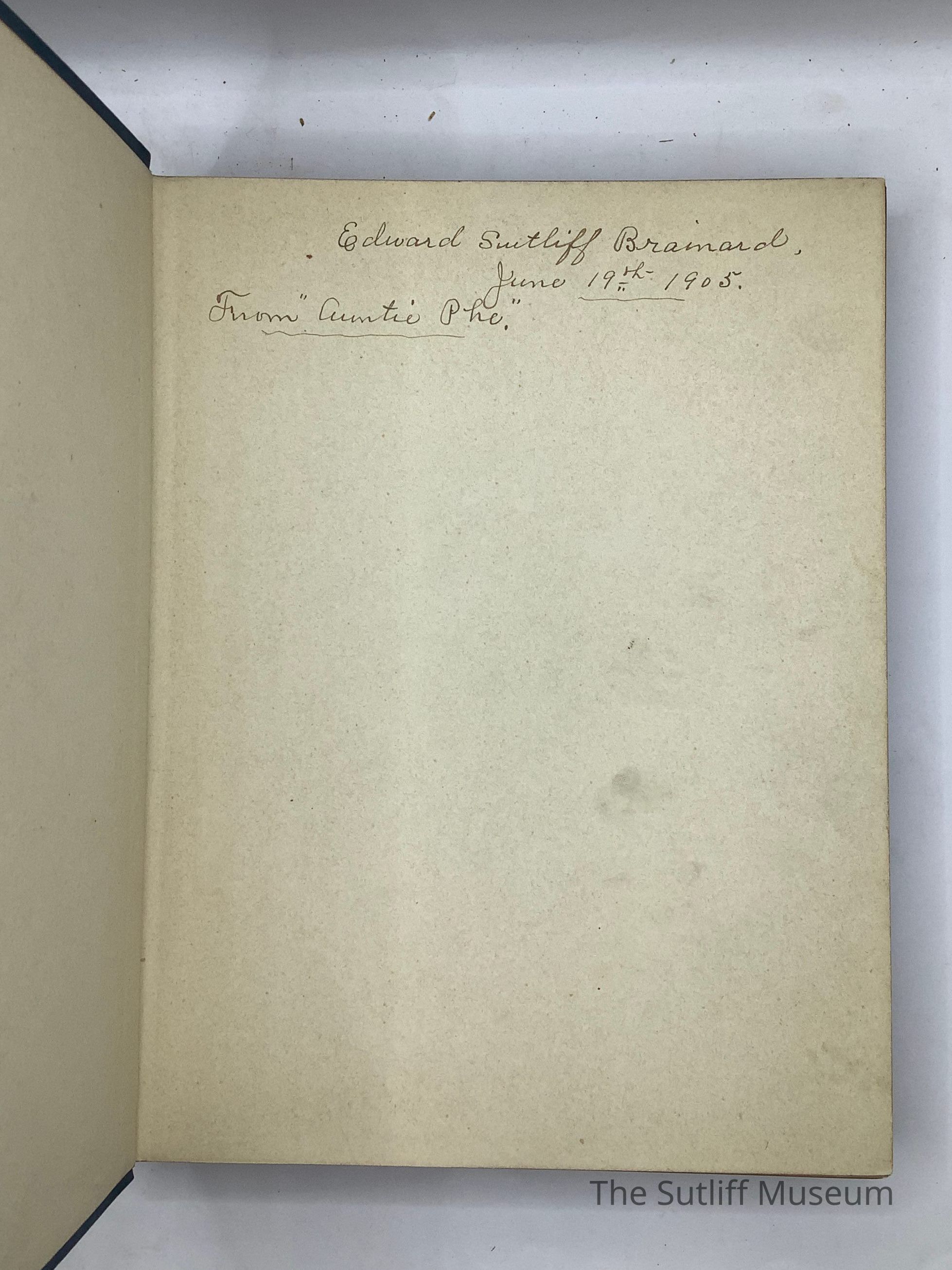 Blue hard bound copy of Robinson Crusoe. 328 pages with illustrations. Pages terminate in red on edges. Handwritten inscription on frontspiece reads "Edward Sutliff Brainard, June 19, 1905, From "Auntie Phe."