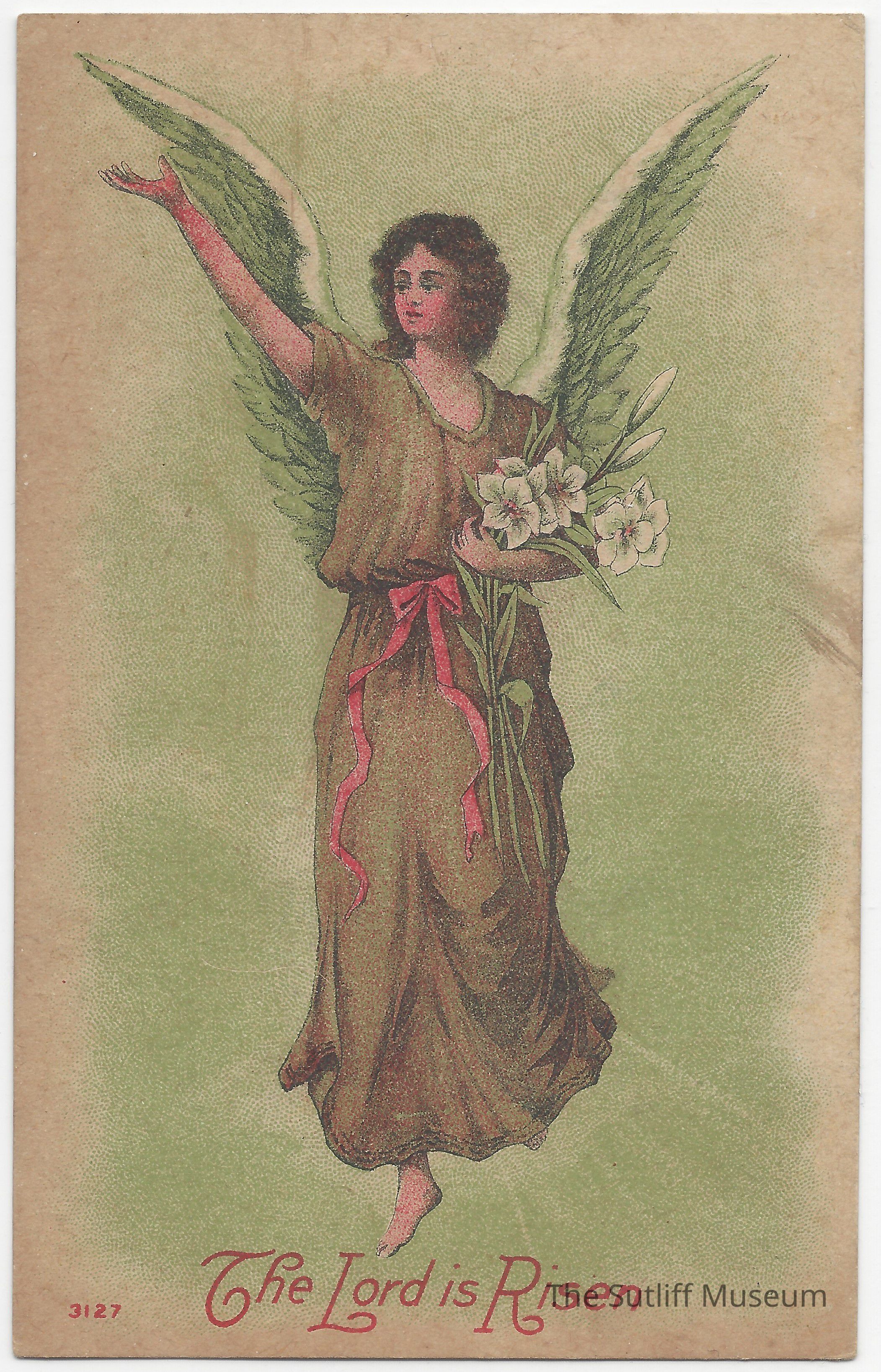 Easter postcard that depicts an angel with flowers and the phrase "The Lord is Risen" at the bottom.