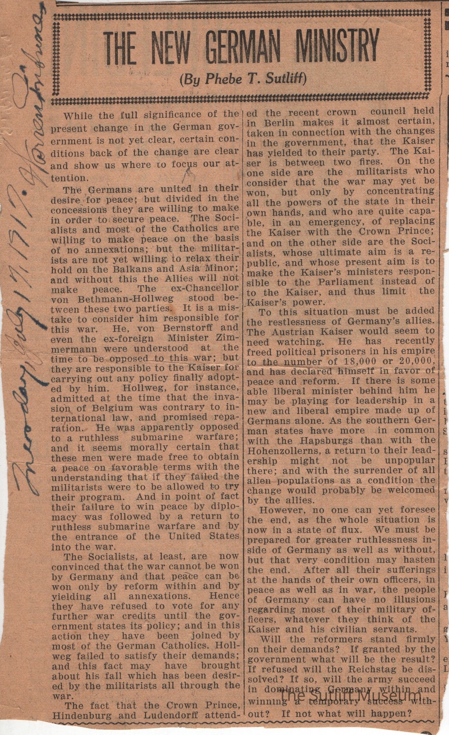 An article titled "The New German Ministry" by Phebe T. Sutliff. Dated 7/17/1917Collection