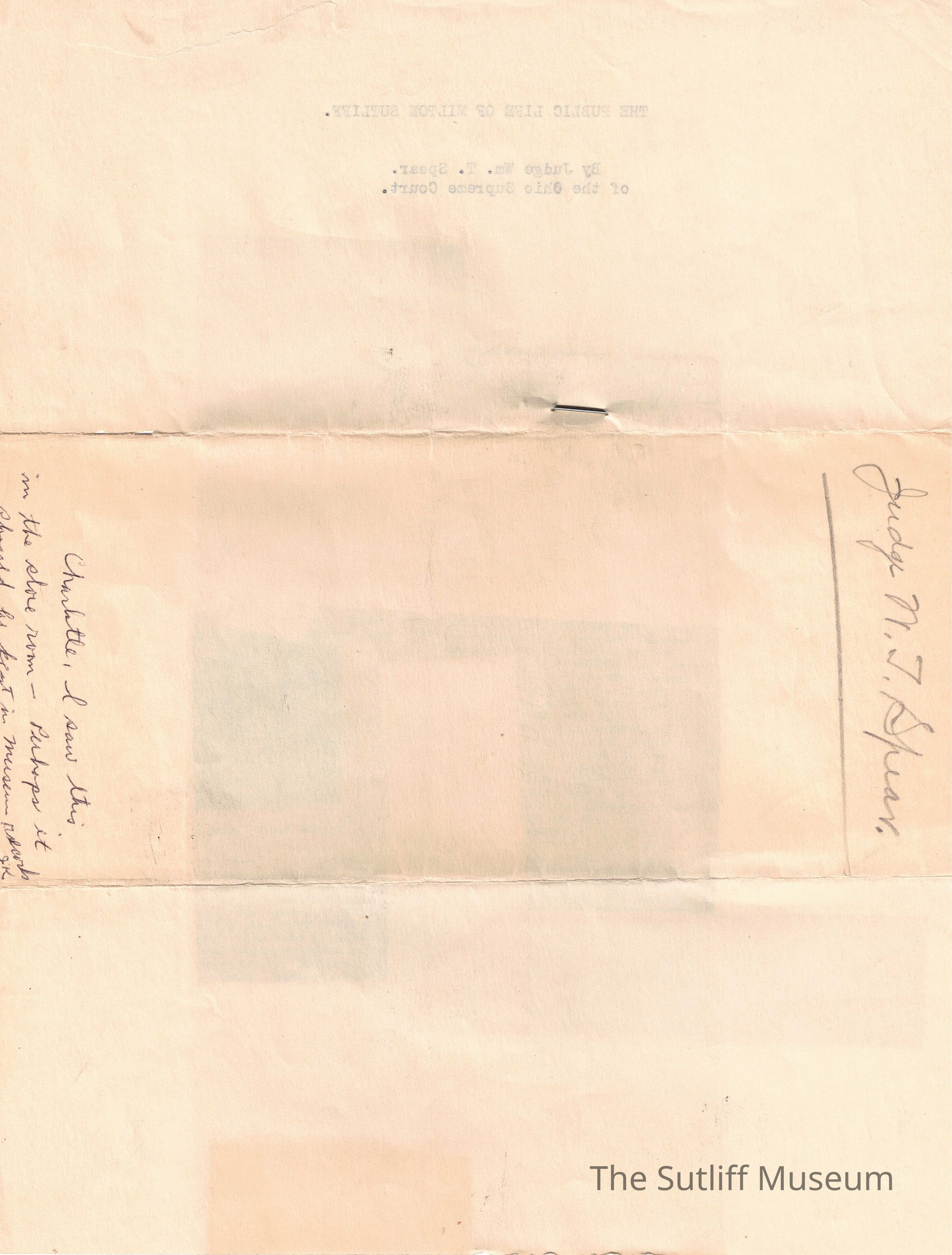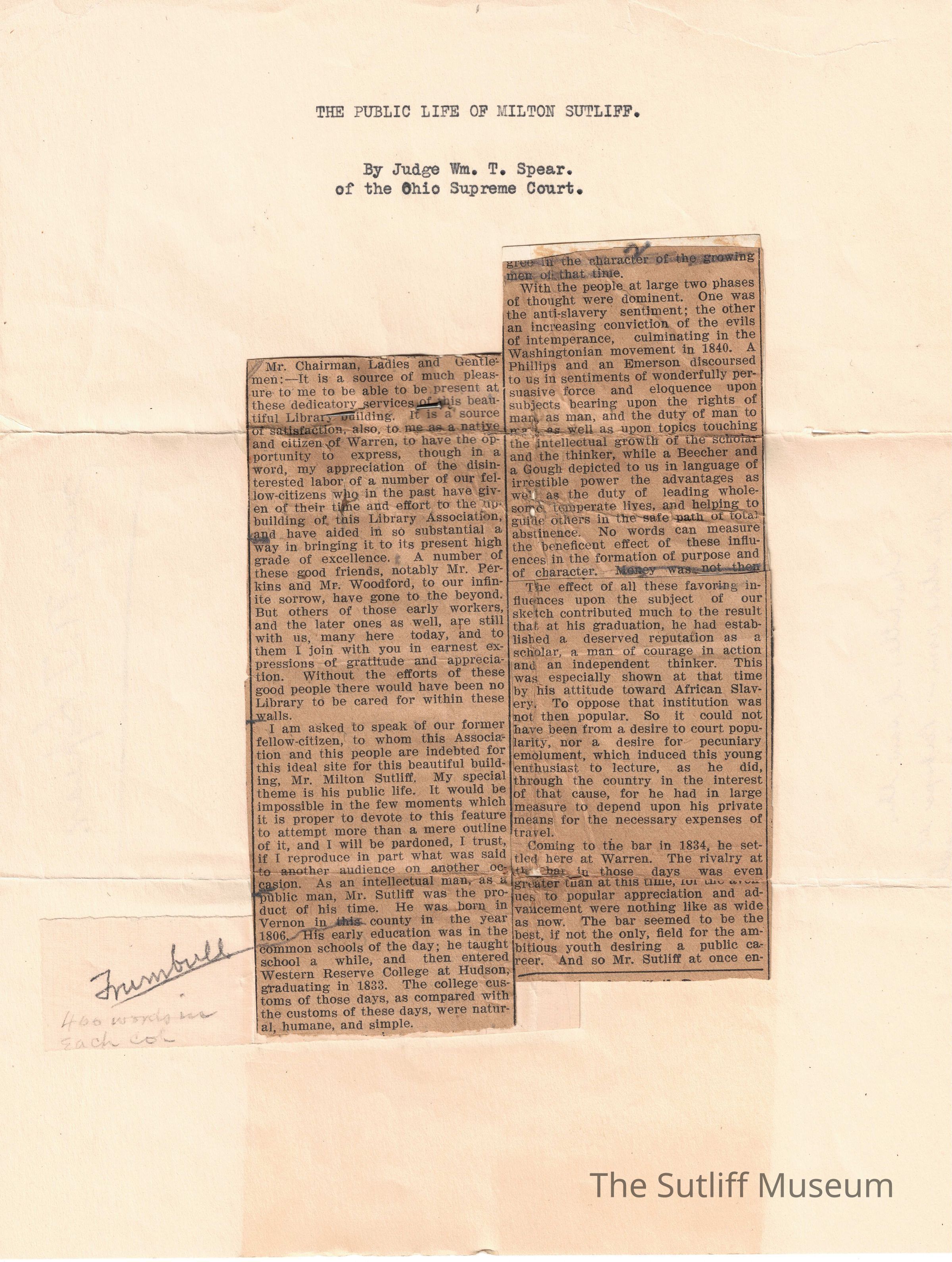 A newspaper clipping titled "The Public Life of Milton Sutliff" by Judge Wm. T. Spear of the Ohio Supreme Court.Relationships