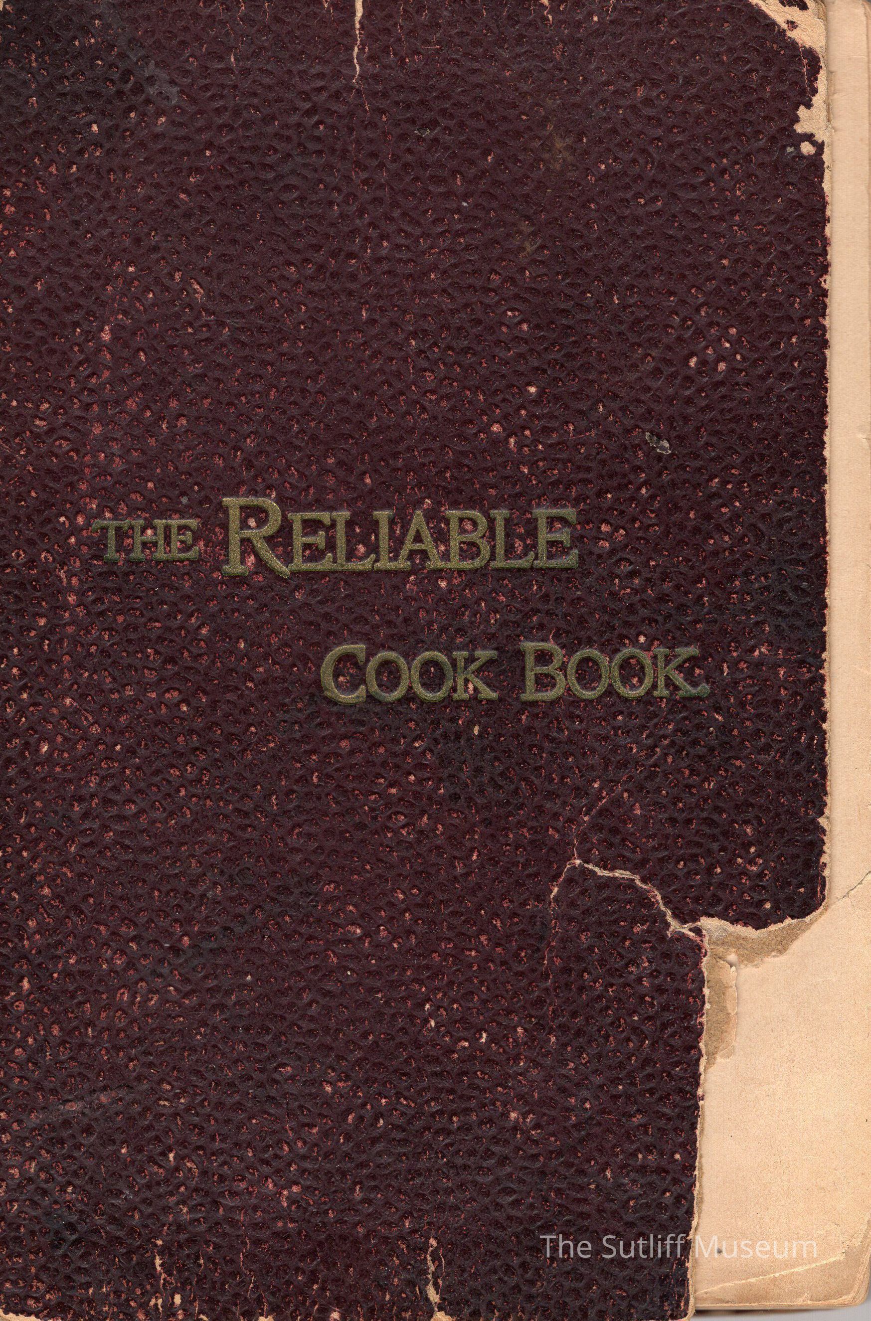 A copy of the The Reliable CookBook, published by the Ladies Aid Society of the First Baptist Church, Warren, Ohio May 1898. Brown faux leather cardboard cover is in two pieces, front cover has gold text "The Reliable CookBook."
