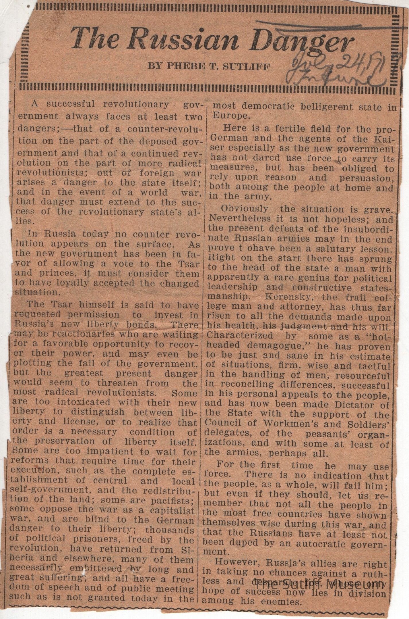 An article titled "The Russian Danger" by Phebe T. Sutliff. Dated 7/24/1917Collection