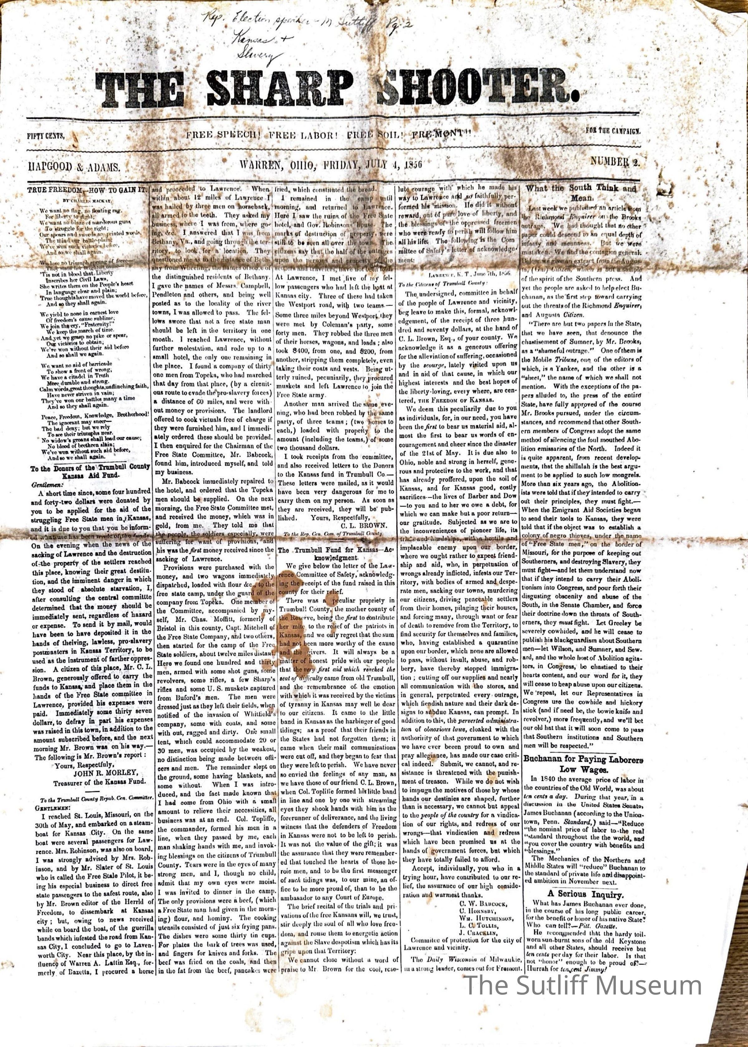 The Sharp Shooter Newspaper, published on July 4, 1856.