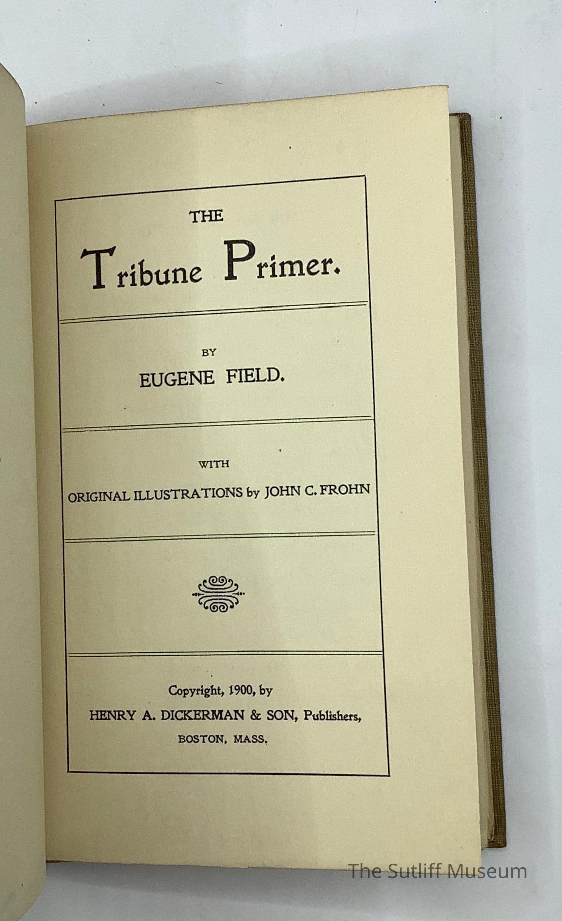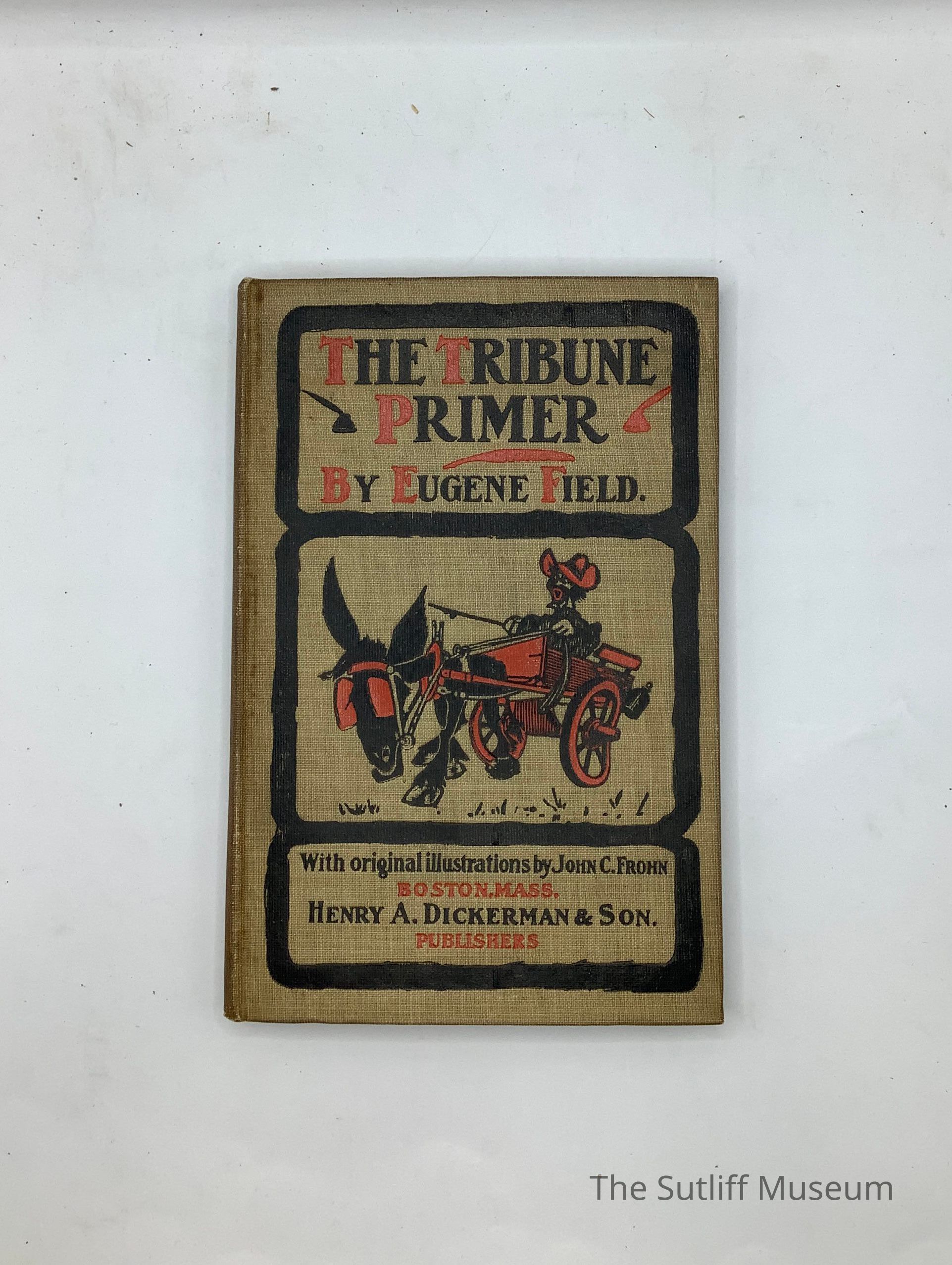 Cloth hard bound copy of The Tribune Primer. Tan cover with black order and black and red text. An image of mule puling cart in red and black on front.
