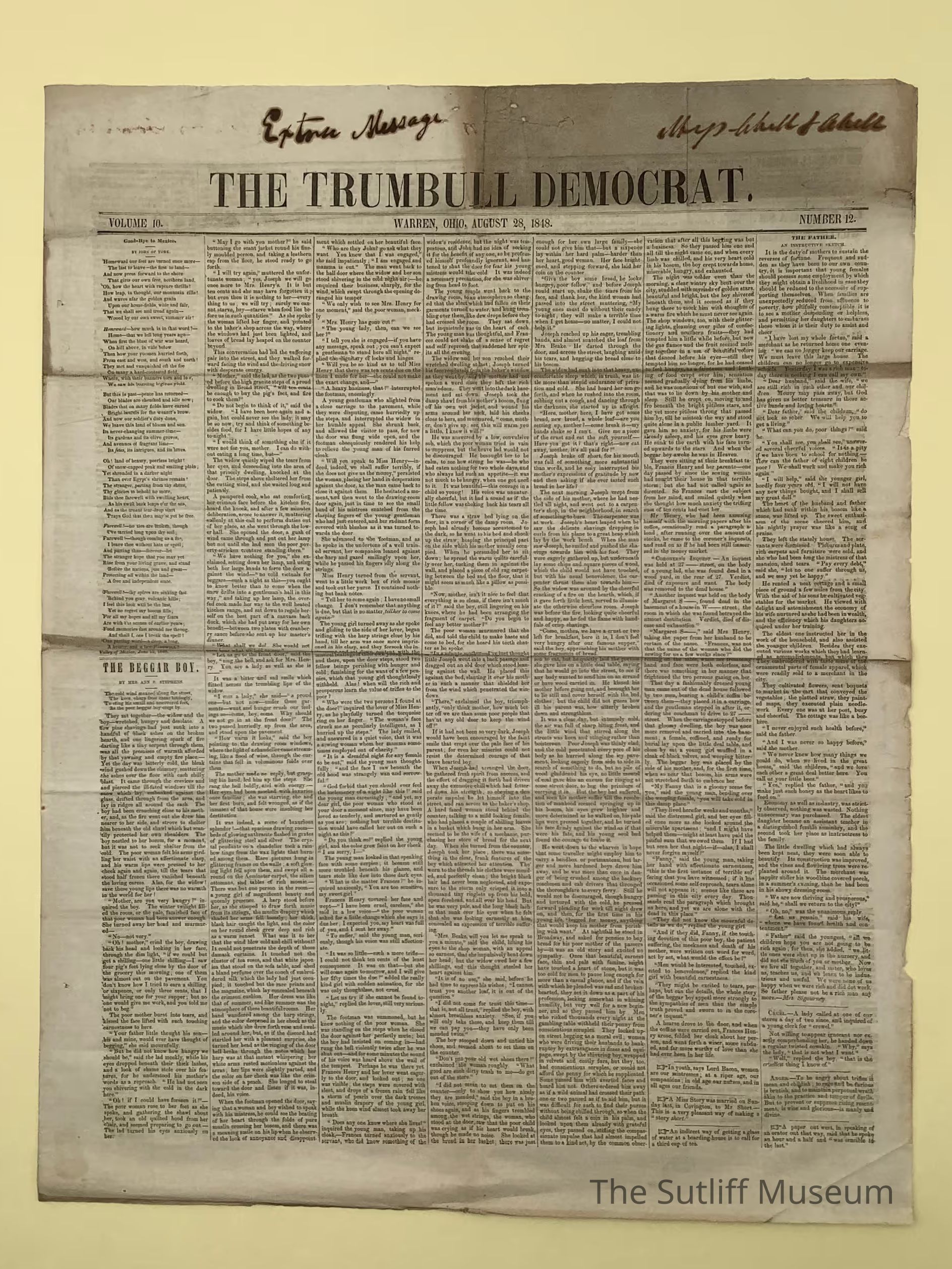 The Trumbull Democrat newspaper published on August 28, 1848.Collection