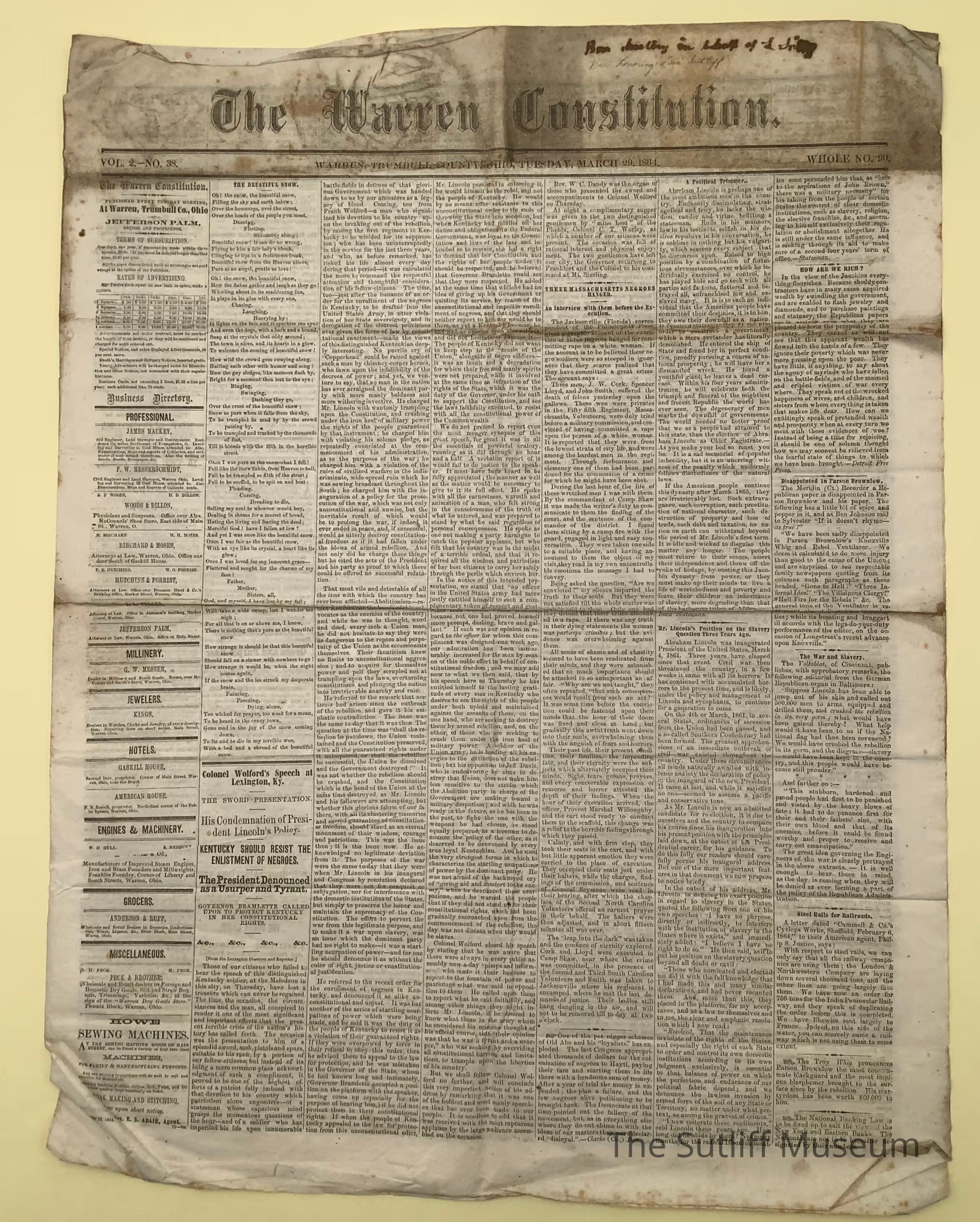 The Warren Constitution published on March 29, 1864. This edition discusses Col. Wexford's speech condemning President Lincoln and Bar honors for Levi Sutliff.Collection
