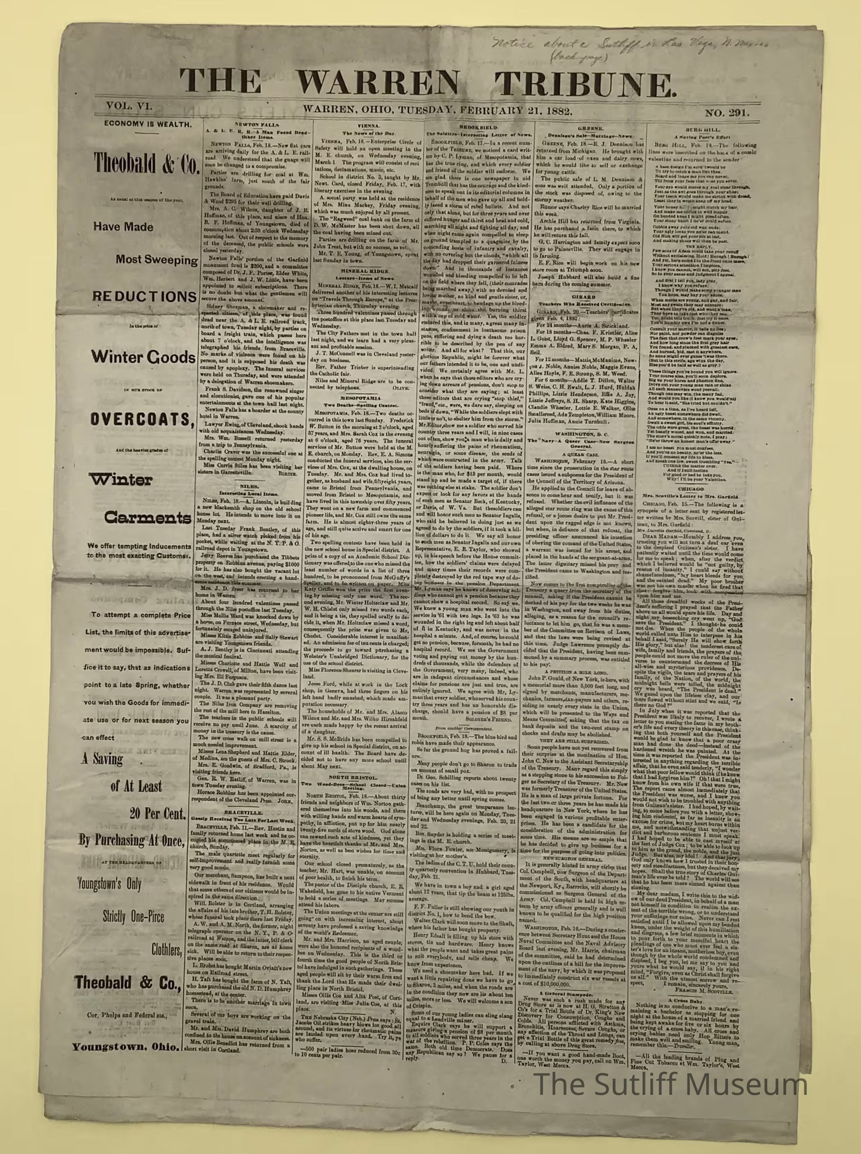 The Warren Tribune published on February 21, 1882. This edition discusses President Arthur's administration.Collection