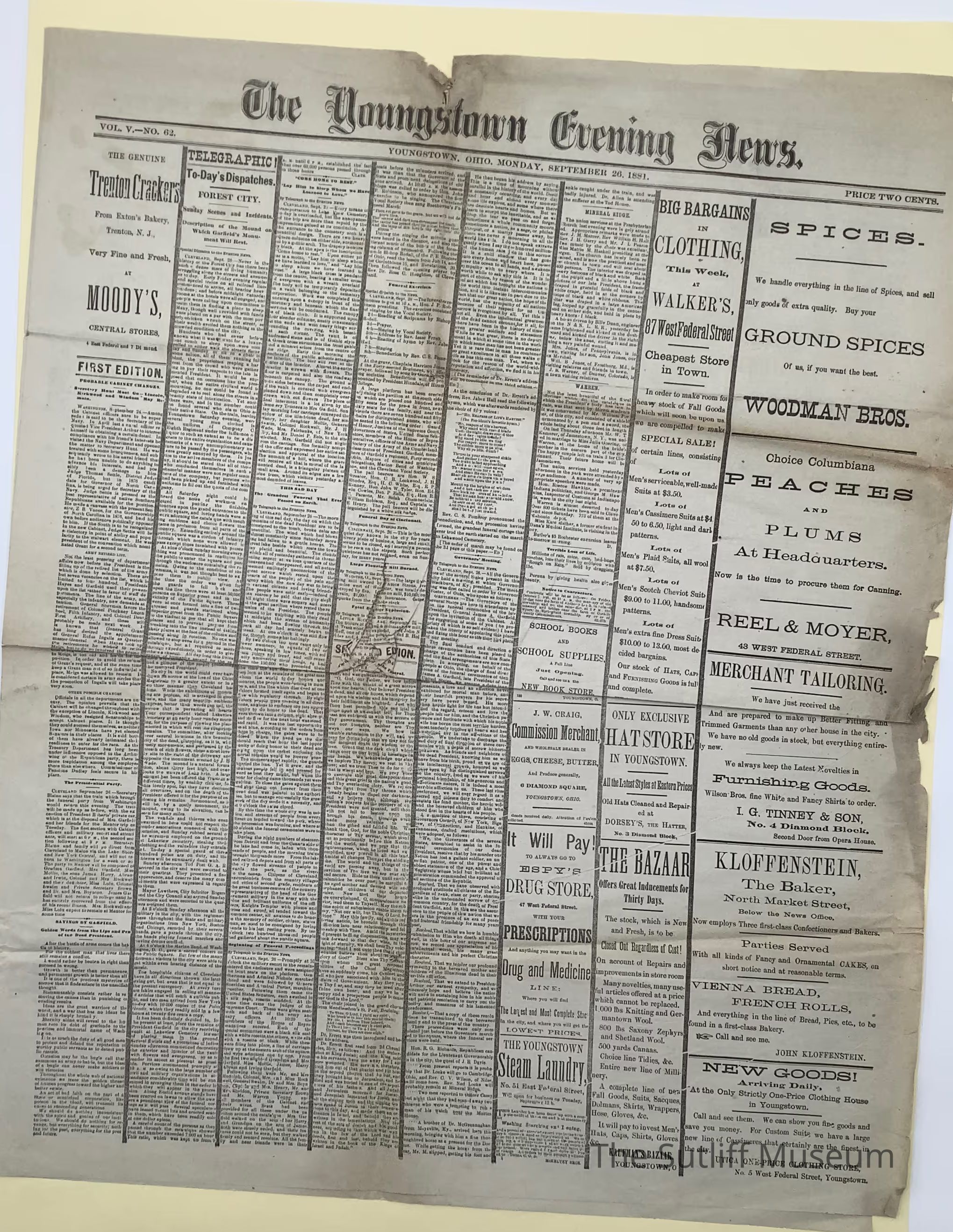 The Youngstown Evening News newspaper published September 26, 1881. This edition discusses President Garfield's resting place and funeral details.Collection