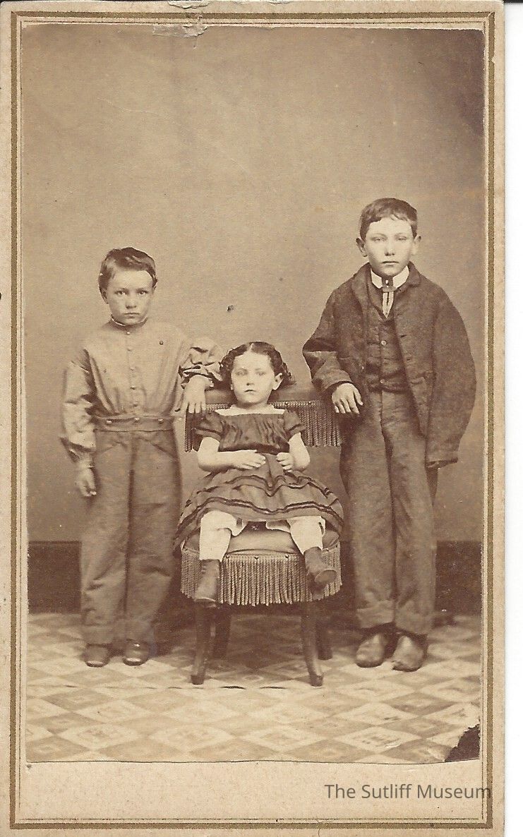 Photograph of three unidentified children, 2 boys and one girl. The back has the initials "MAB" written on the bottom.