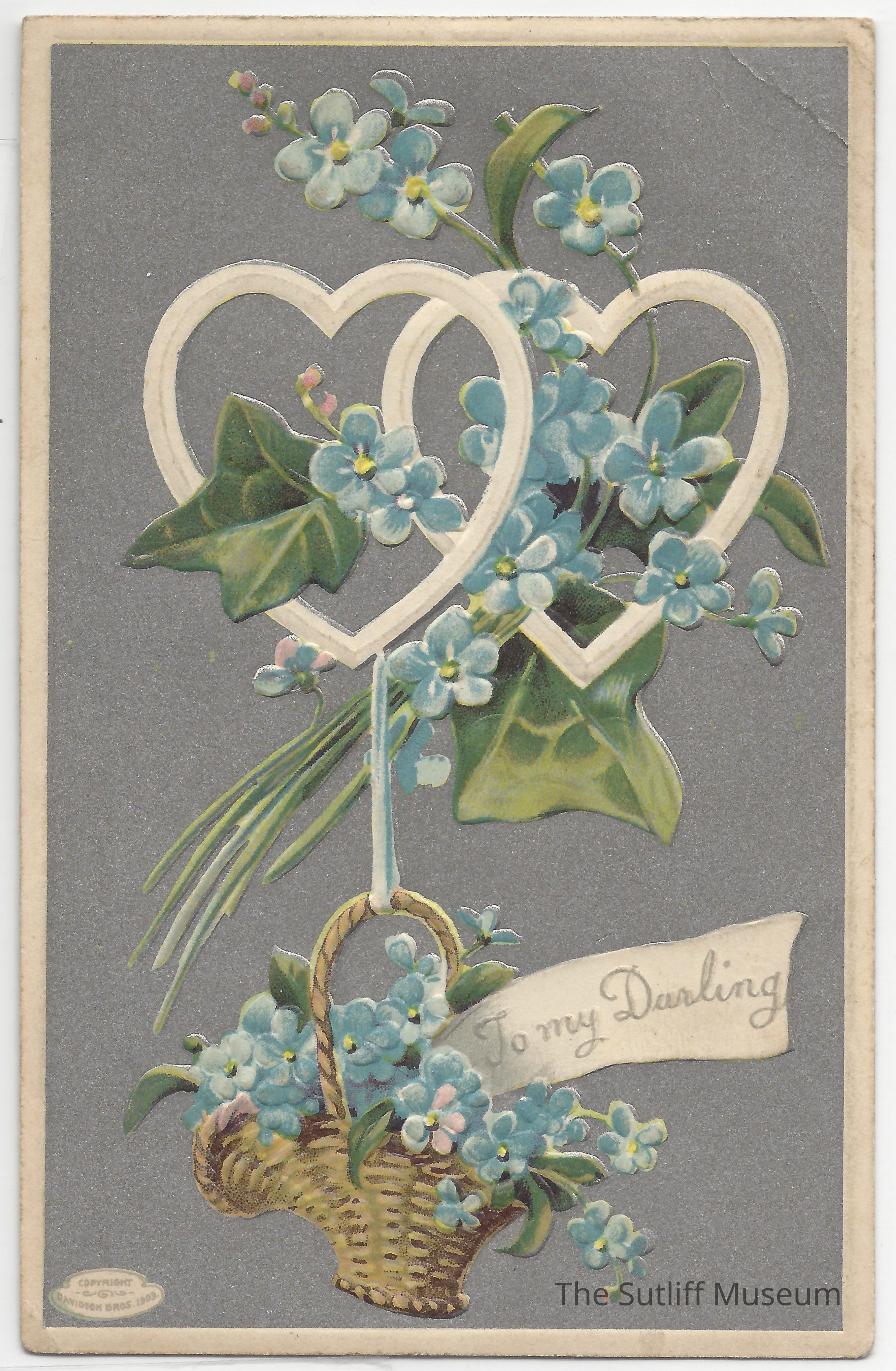 A postcard depicting a basket of blue flowers with a sign that says "To my Darling" as well as two intertwined white hearts.