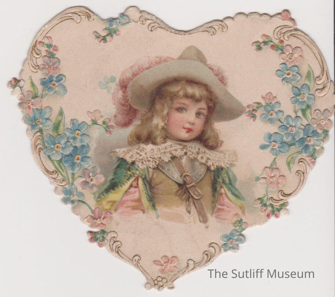 Heart shaped valentines day card with floral motif and a child in a hat on the front and "To My Velentine/ One heart I prize,/ and thar the best,/ The world, for me,/ may take/ the rest" printed on the back. On the back in black ink handwritten reads "Aunt Phe Feb 14th 1899"Collection