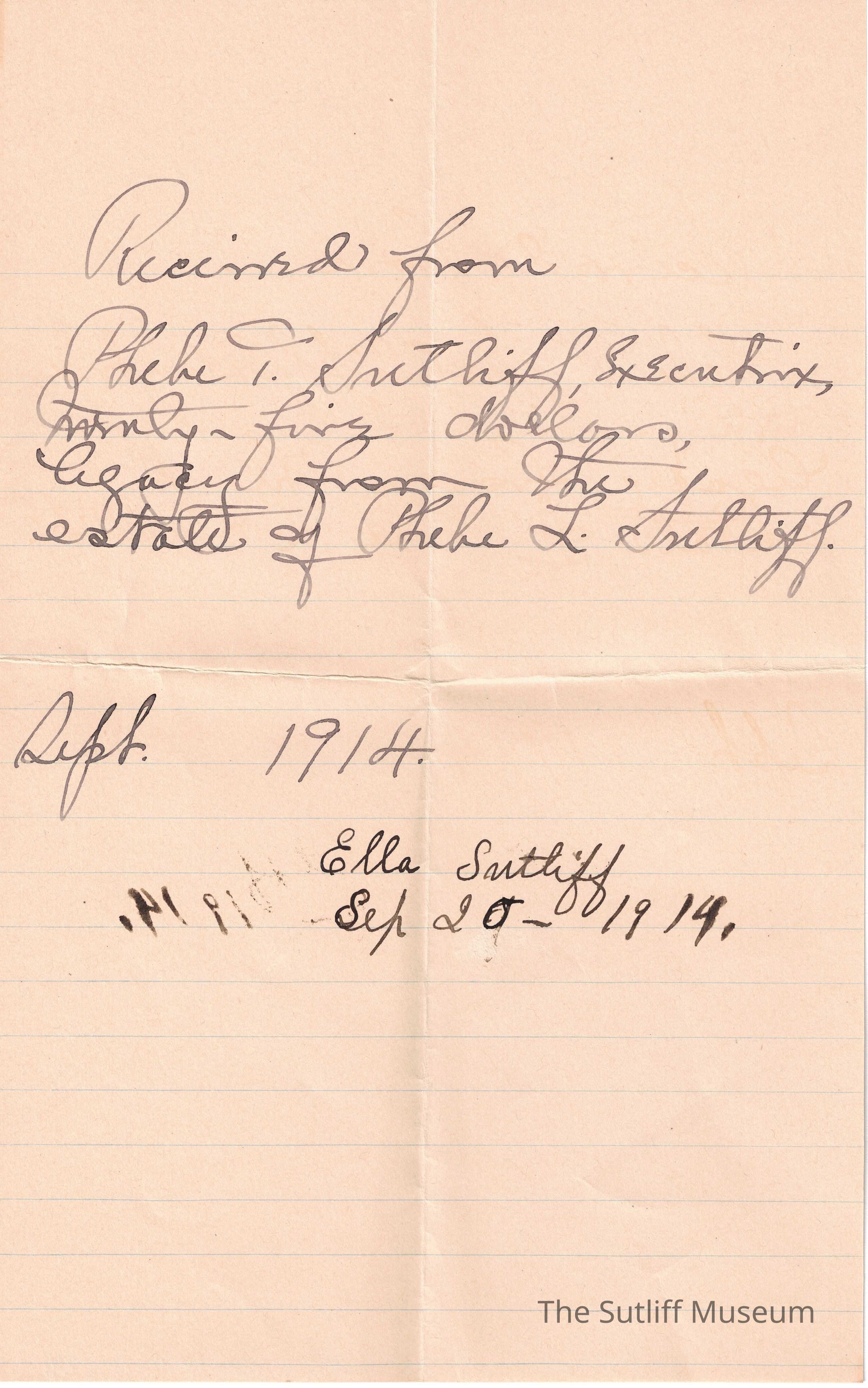 A note from Ella Sutliff to Phebe T. Sutliff that she has received her inheritance from Phebe Lord Marvin Sutliff. Associated with Phebe Lord Marvin Sutliff's death receipts.Collection