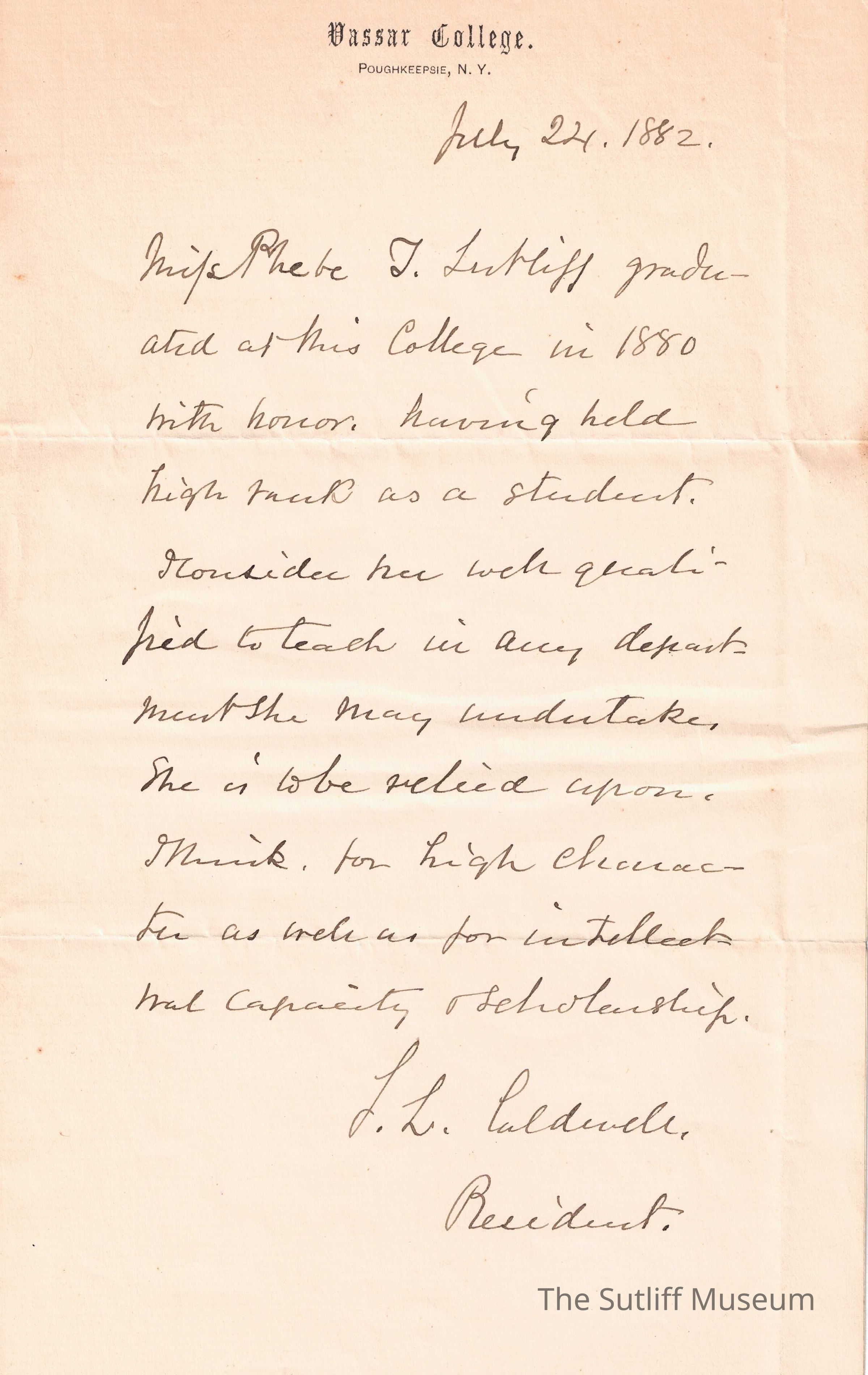 Letter to Phebe T. Sutliff from S.L. Caldwell, the President of Vassar CollegeRelationships