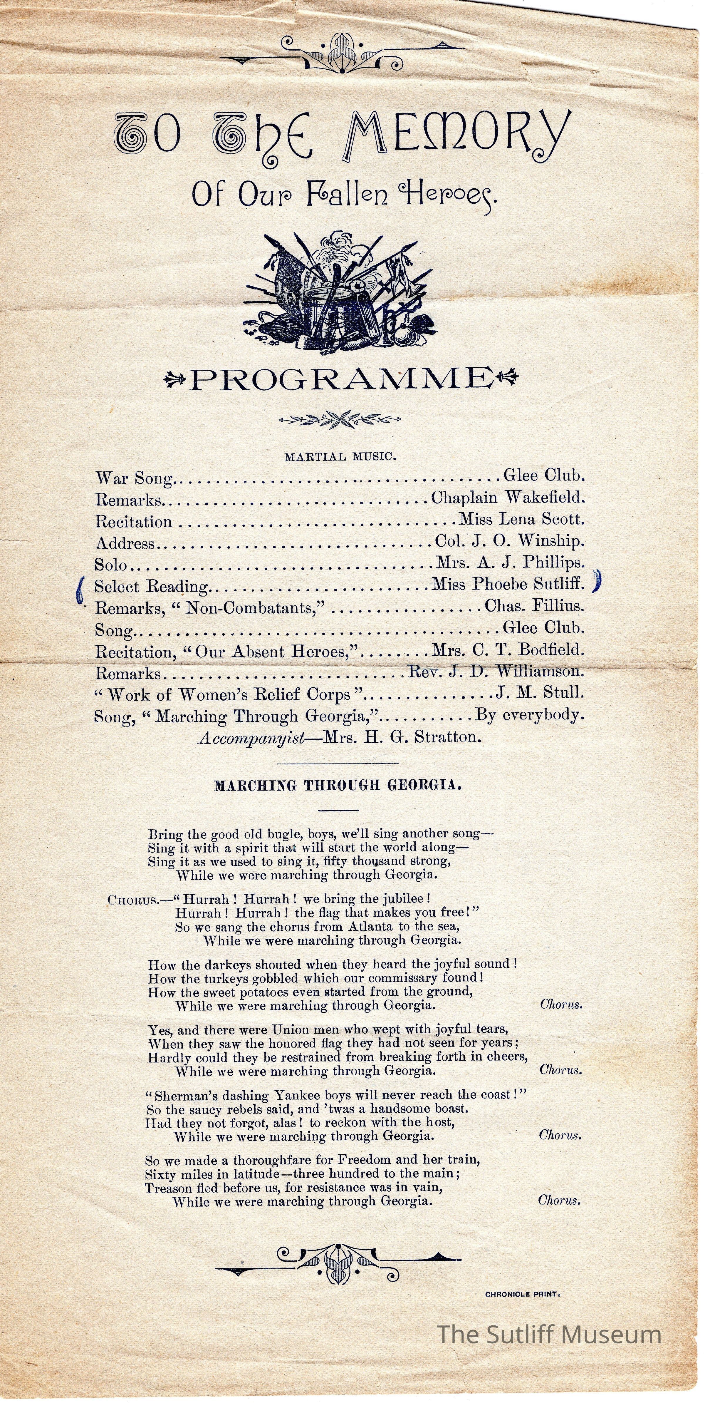 To the Memory of Our Fallen Heroes programme with a speech given by Phebe T. Sutliff.Collection