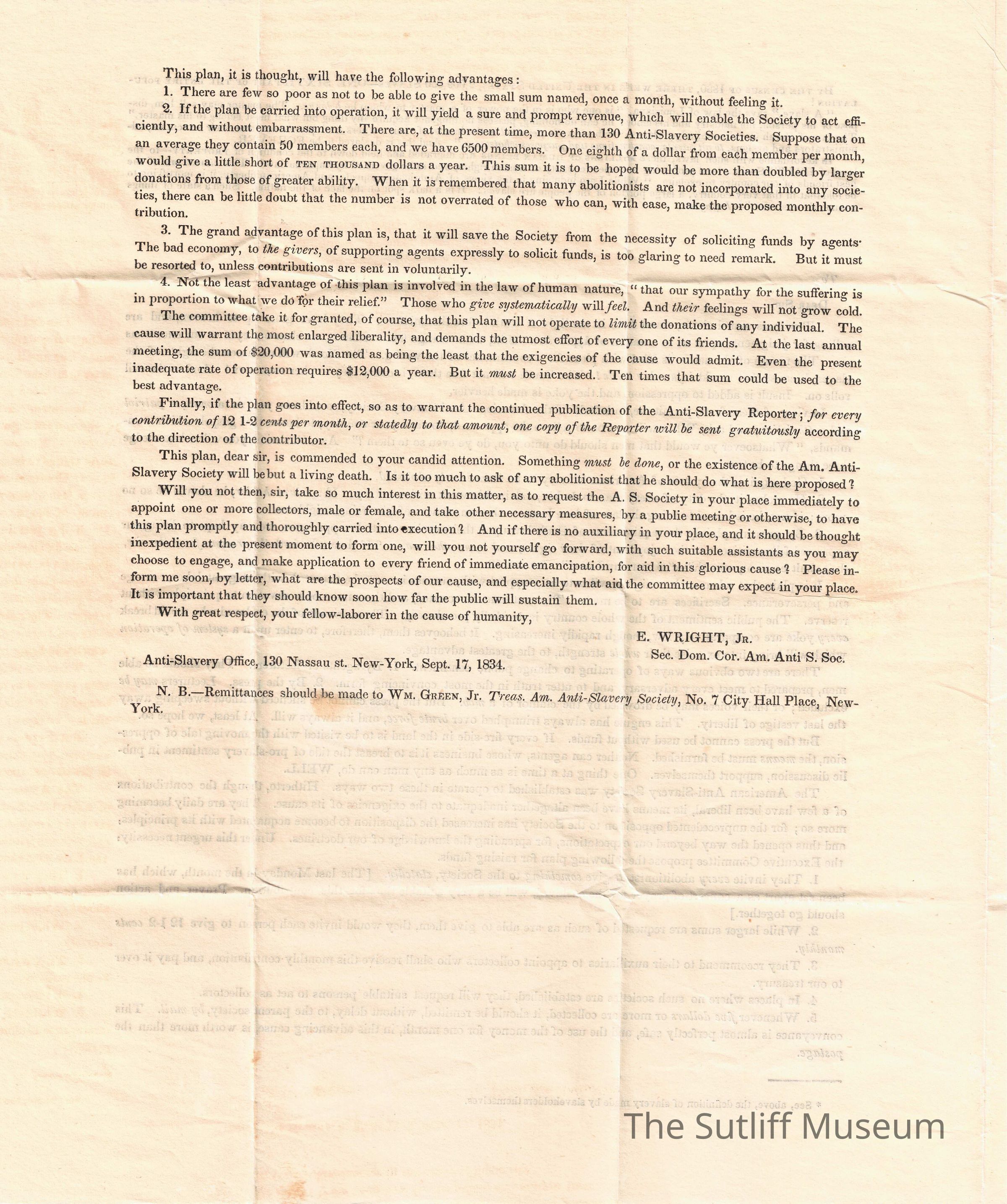 A letter from E. Wright Jr. to the Secretary of the Anti-Slavery Society of Vernon, Mary Plumb, regarding the current status of slavery and the evil they are fighting.Collection
