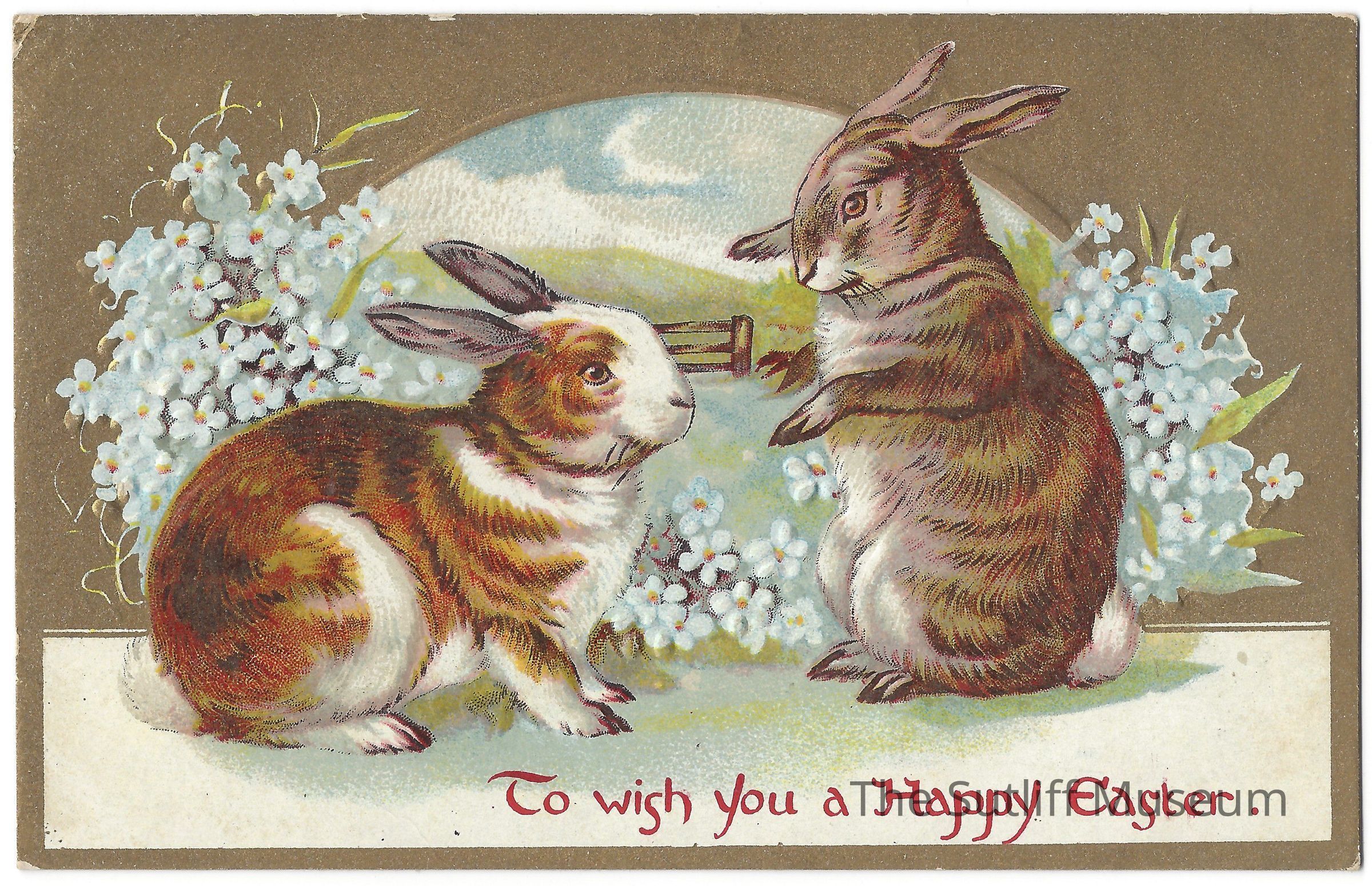 Easter postcard that depicts two rabbits and the phrase "To wish you a Happy Easter." at the bottom.