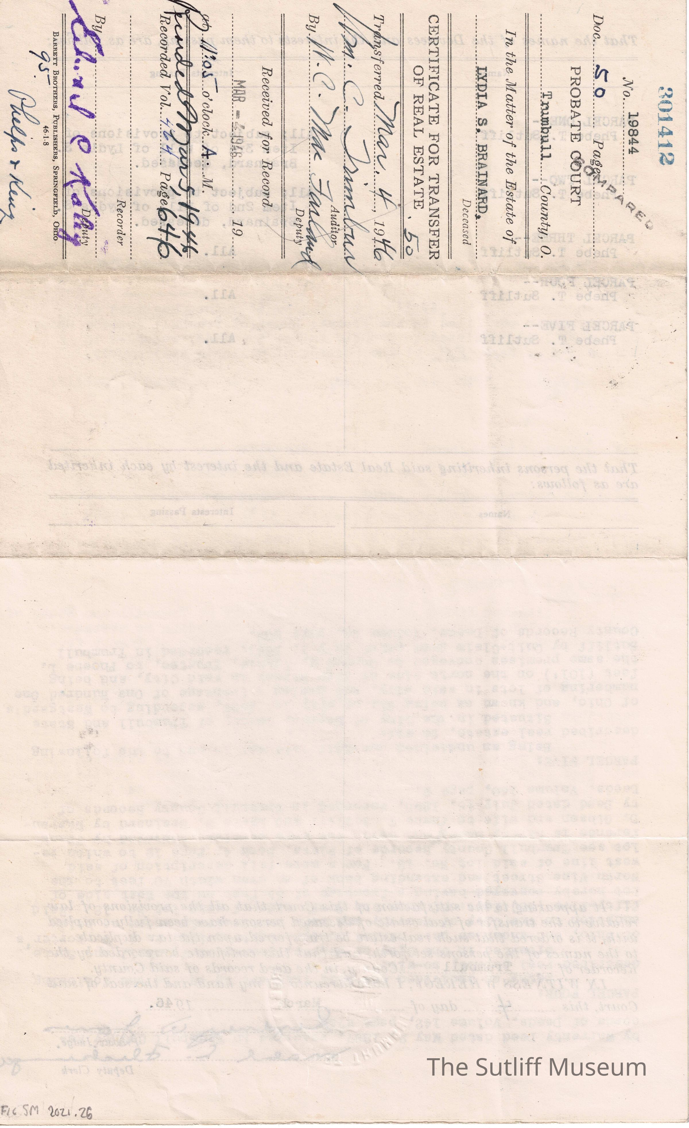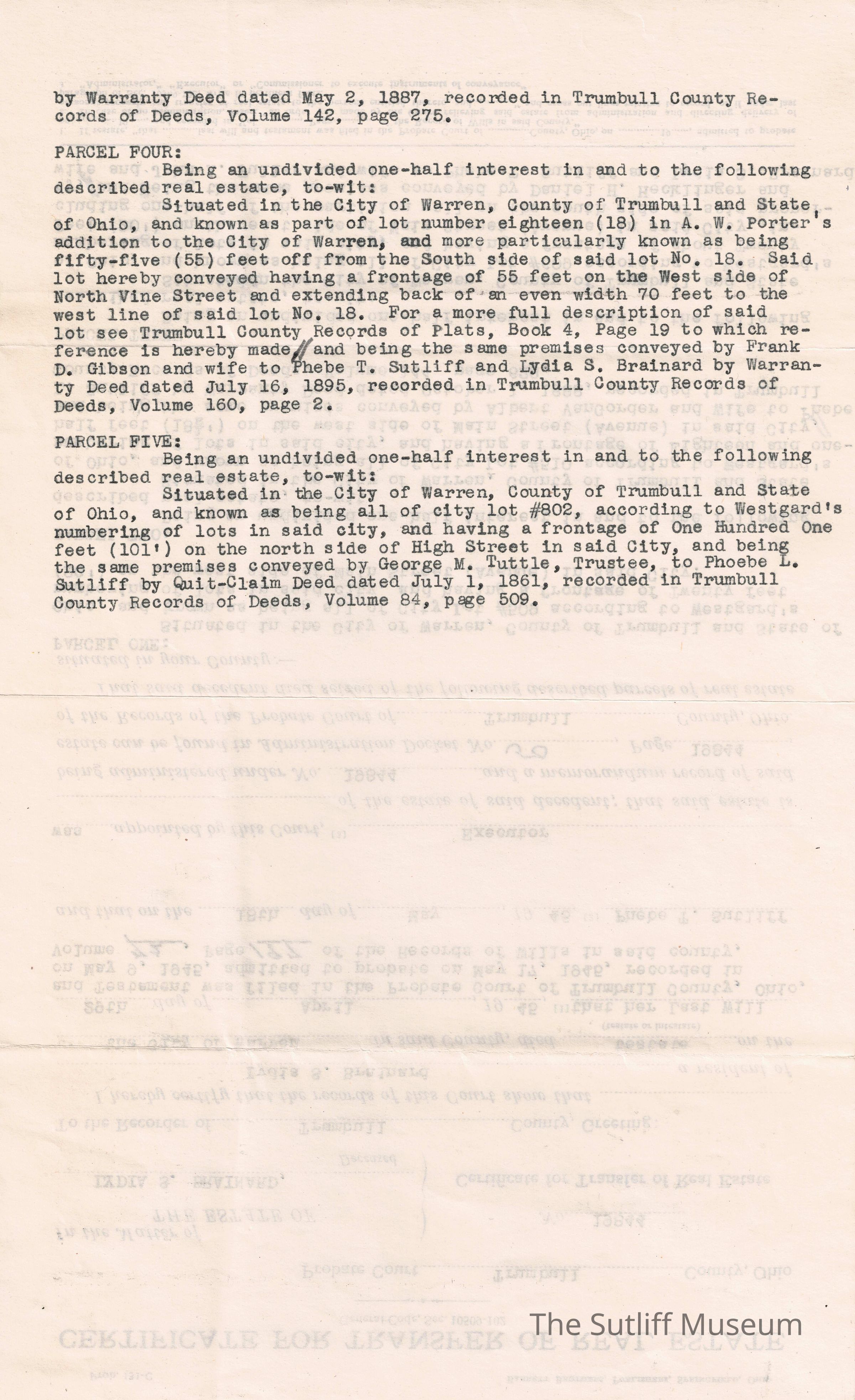 A Certificate for Transfer of Real Estate regarding the estate of Lydia S. Brainard to Phebe Temperance Sutliff after her death.Relationships