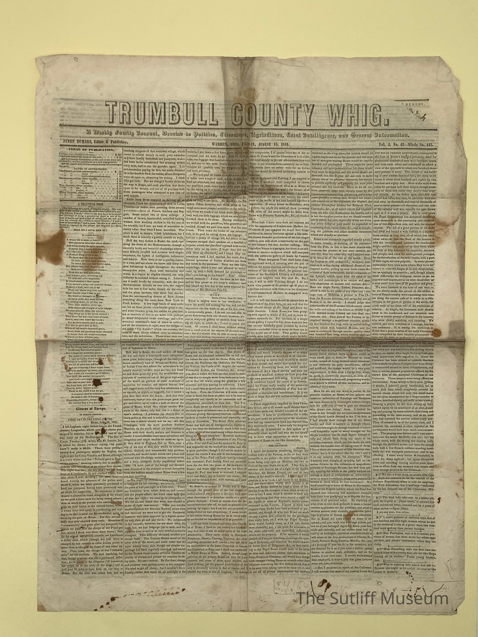 The Trumbull County Whig newspaper published on August 15, 1851.