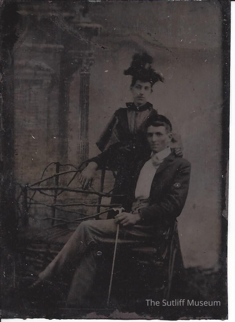 Man and a woman in the tintype that are unidentified. The man is sitting down on a bench holding a cane and there is a woman standing behind him. He appears to be wearing striped pants, a white shirt, and a striped jacket. She is wearing a dress and a decorative hat.