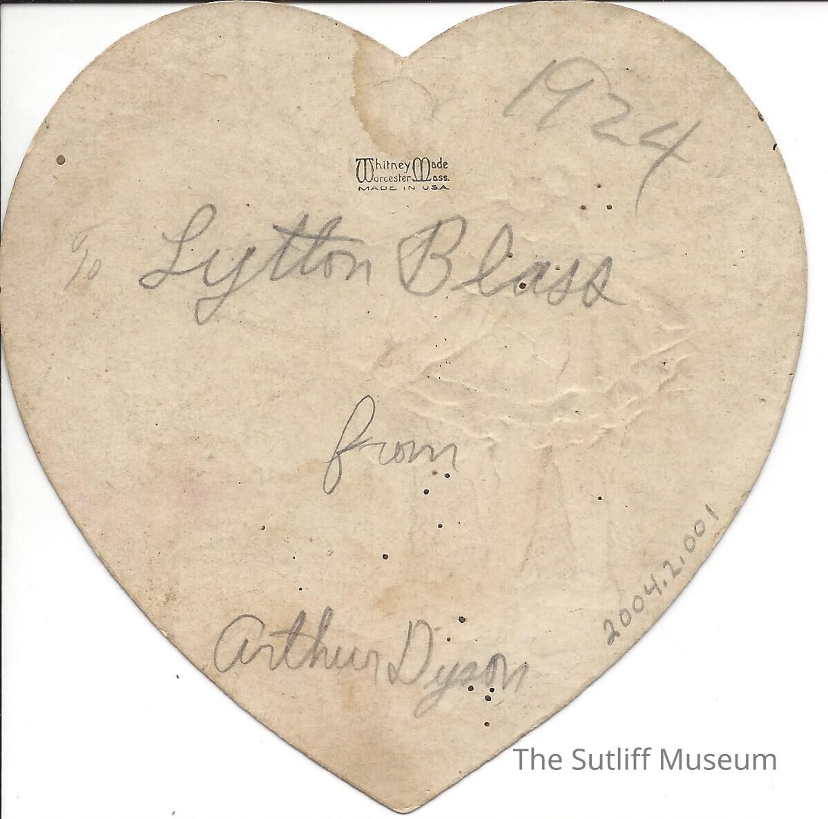 Heart shaped single side Valentine card. On the front is depiction of young boy and girl on yellow background. Text reads, "I'm waiting and longing to hear you say you'll be my Valentine some fine day." Yellow background is bordered by white and single row of small black dots. On reverse written in pencil: To Lytton Blass from Arthur Dyson 1924." Publication note reads "Whitney Made Worchester Mass Made in USA"Collection