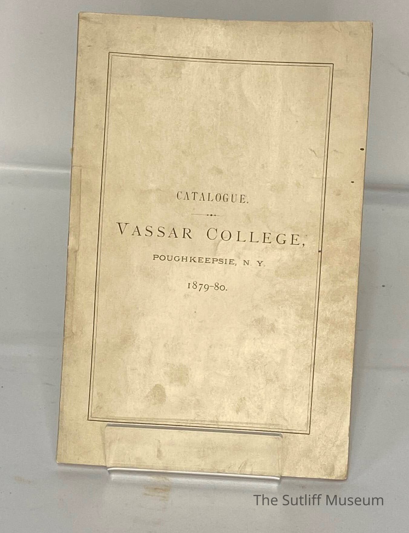 Vassar College Catalog. 46 pages long that outlines enrollment requirements, tuition and other admission information. Printed on plain white paper, the cover text reads, "CATALOGUE. VASSAR COLLEGE, POUGHKEEPSIE, N.Y 1879-80. A black border of two think black lines surrounds the text.