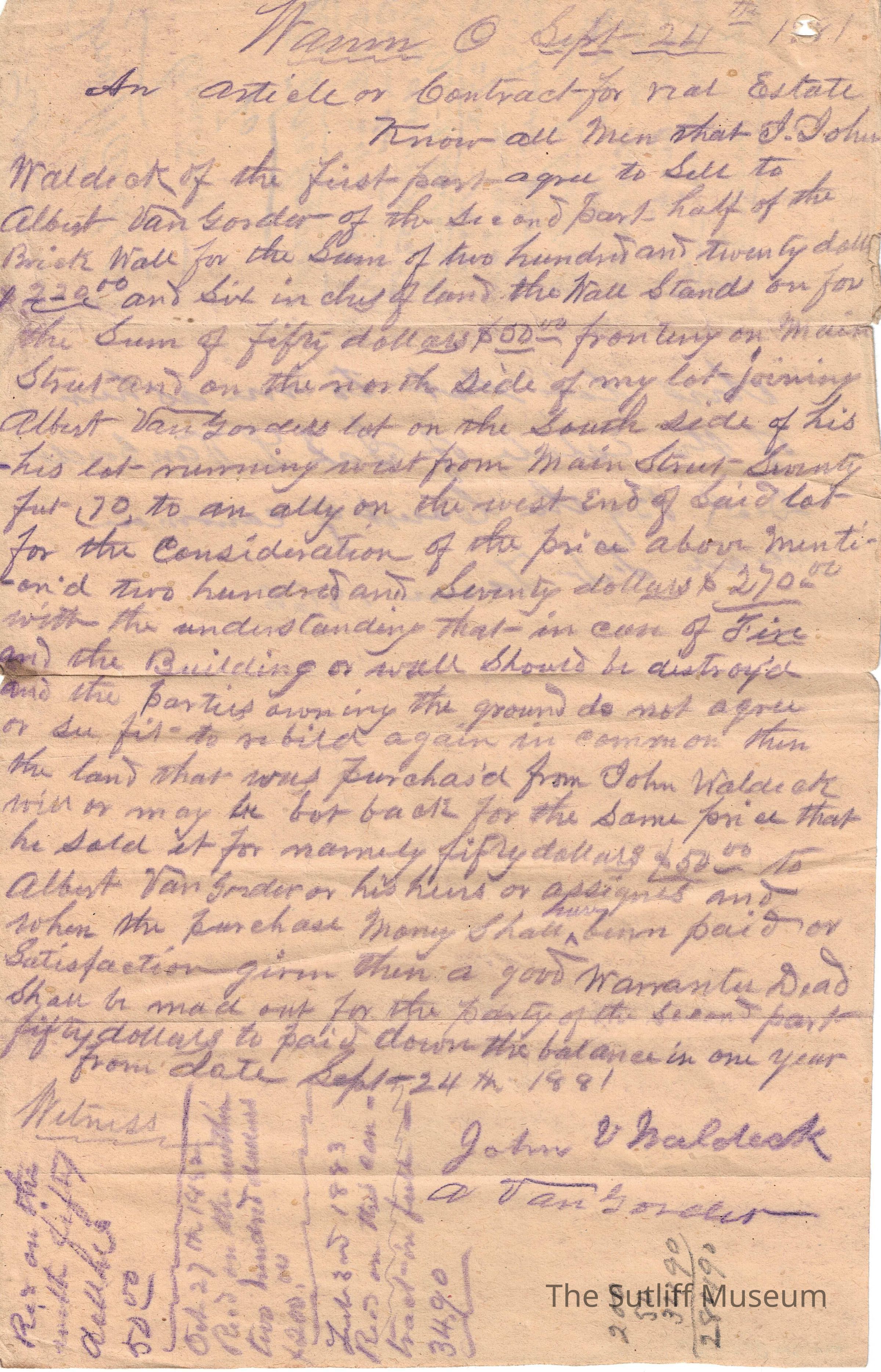 A legal document acting as a contract between John V. Waldeck and Albert Van Gorder.Relationships