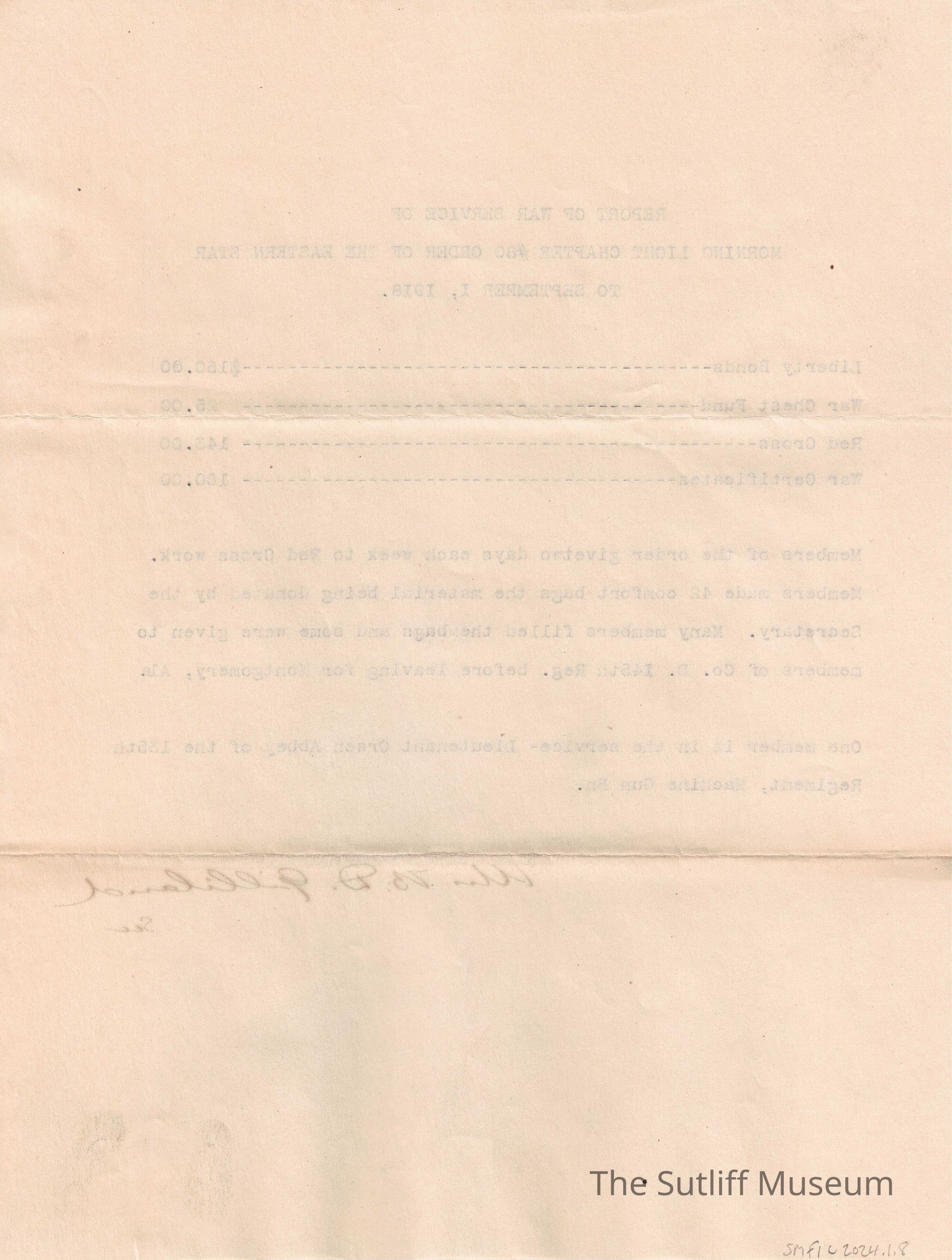 A document of a Report of War Work Service of the Morning Light Chapter #60, Order of the Eastern Star until September 1, 1918 and their contributions to the troops in World War 1.Relationships