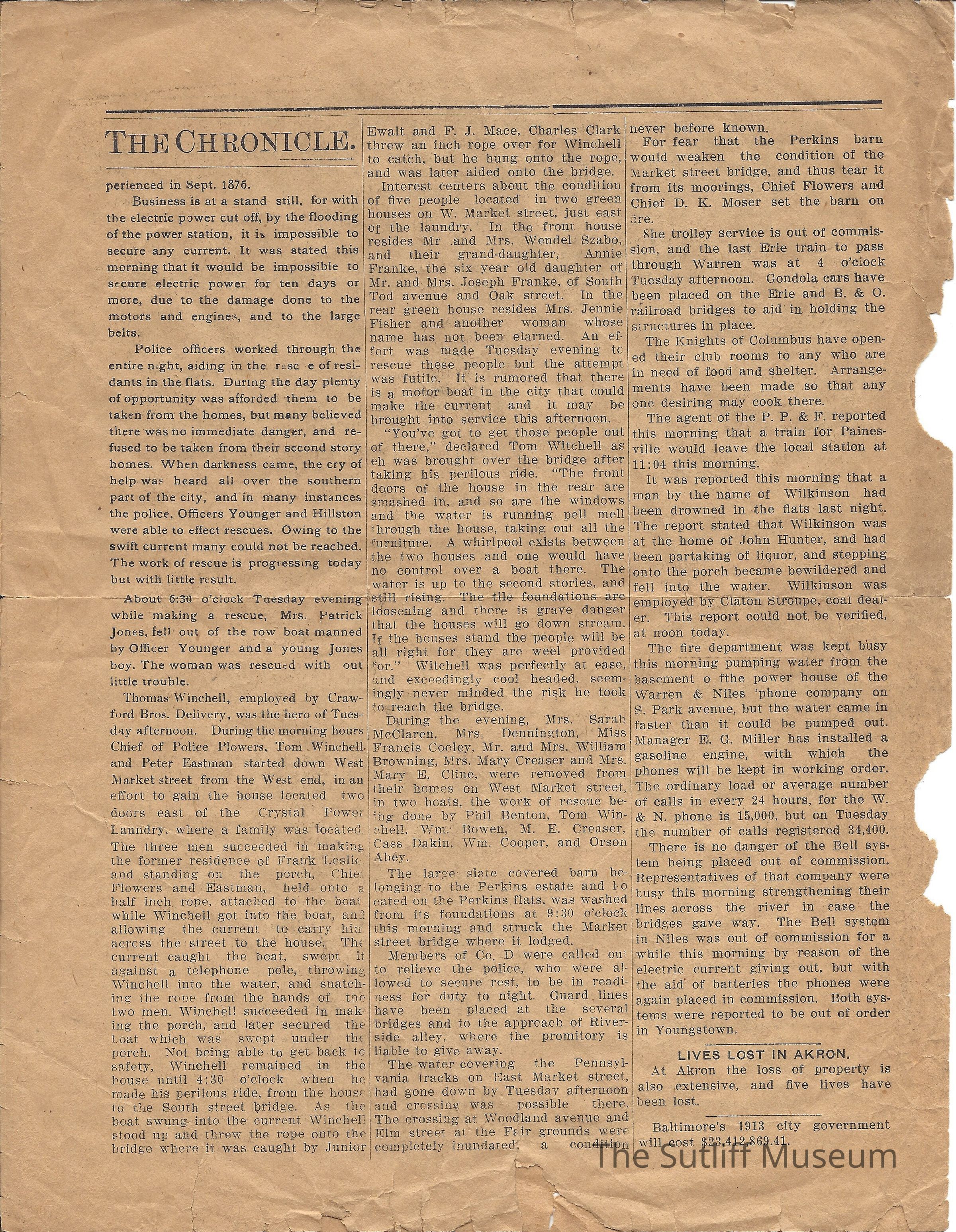 Newspaper clipping-Warren Daily Chronicle Flood Edition dated March 26, 1913. One folded page in plastic sleeve.