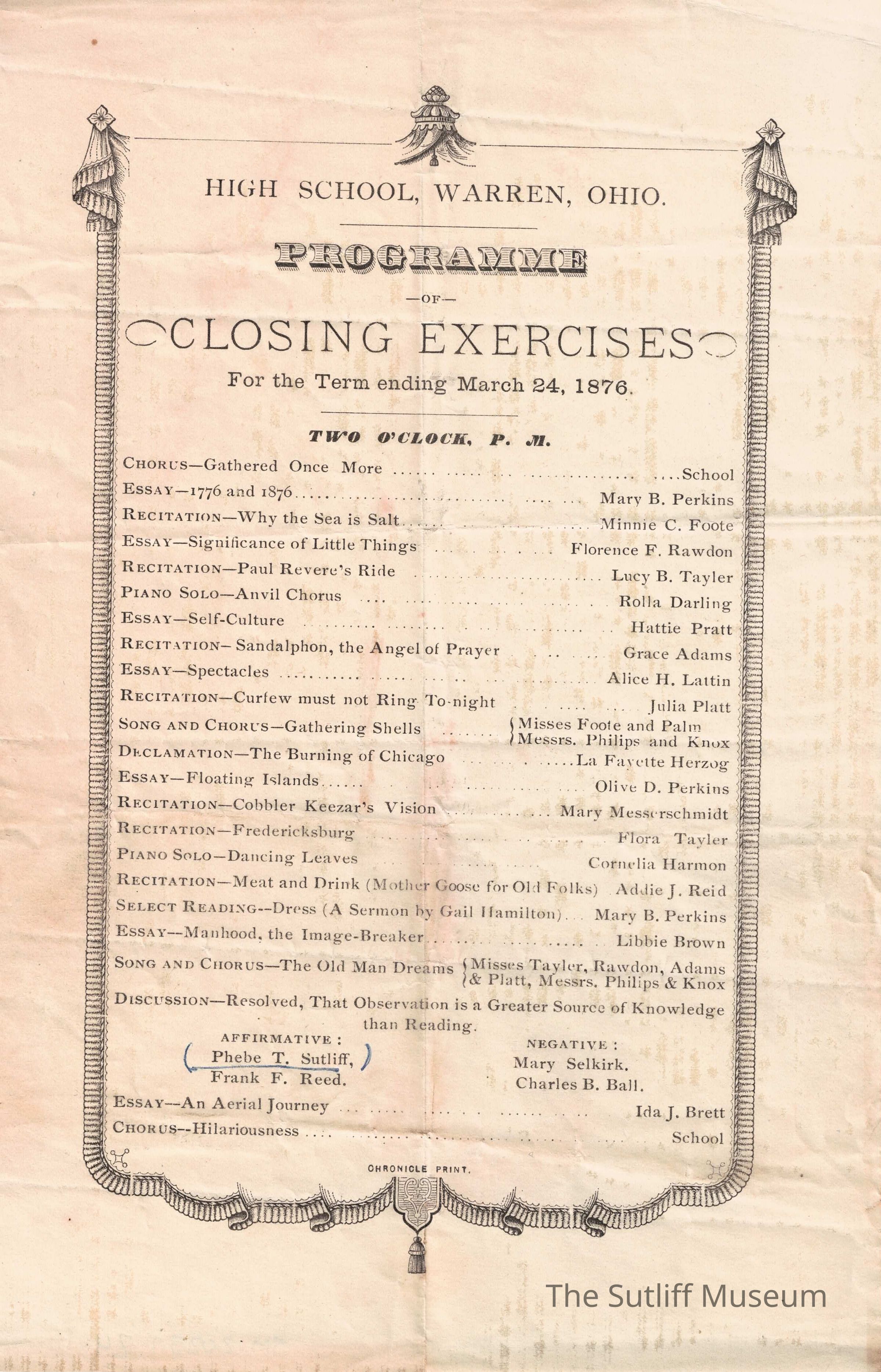 Warren High School Programme or Closing Exercises for the term ending March 24, 1876.Archive Details