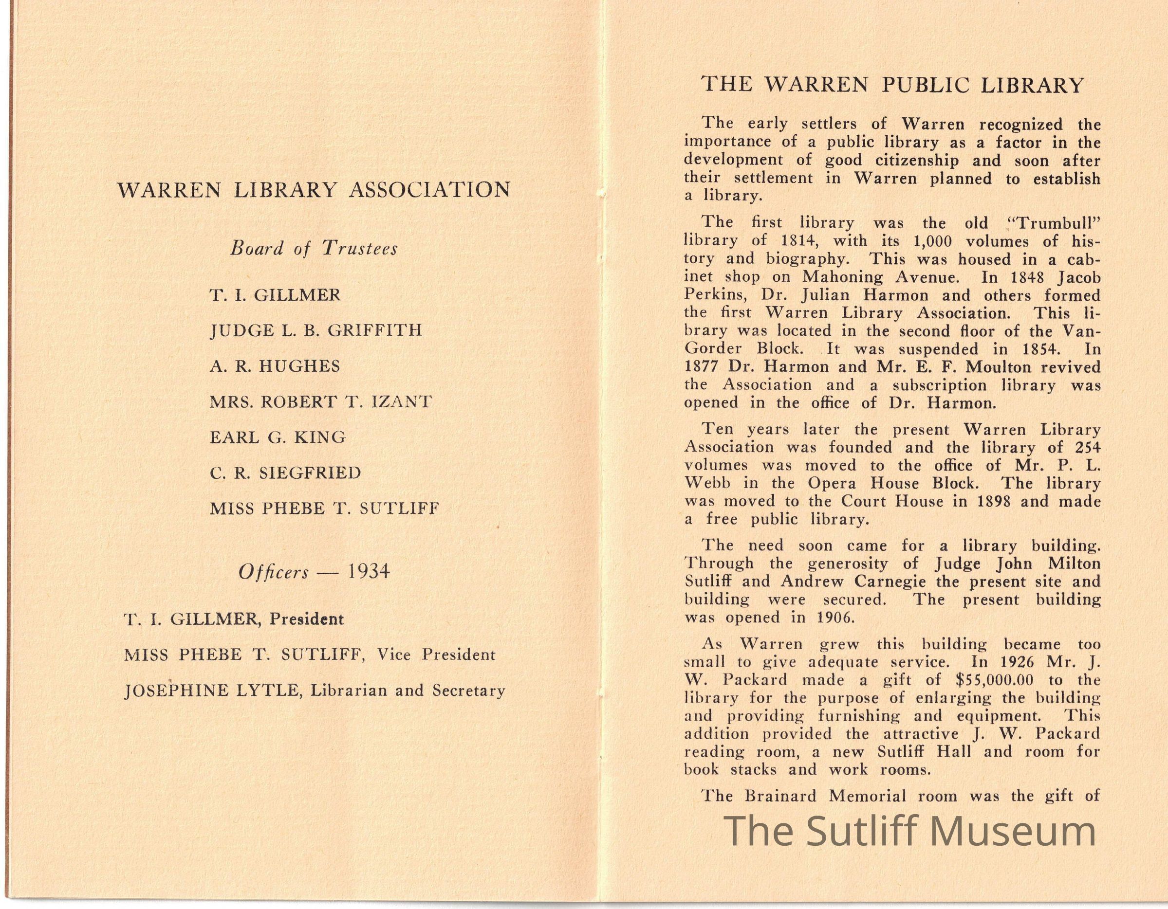 A booklet titled "Warren Library Associated 1934" describing the library itself, the association, and a list of members.