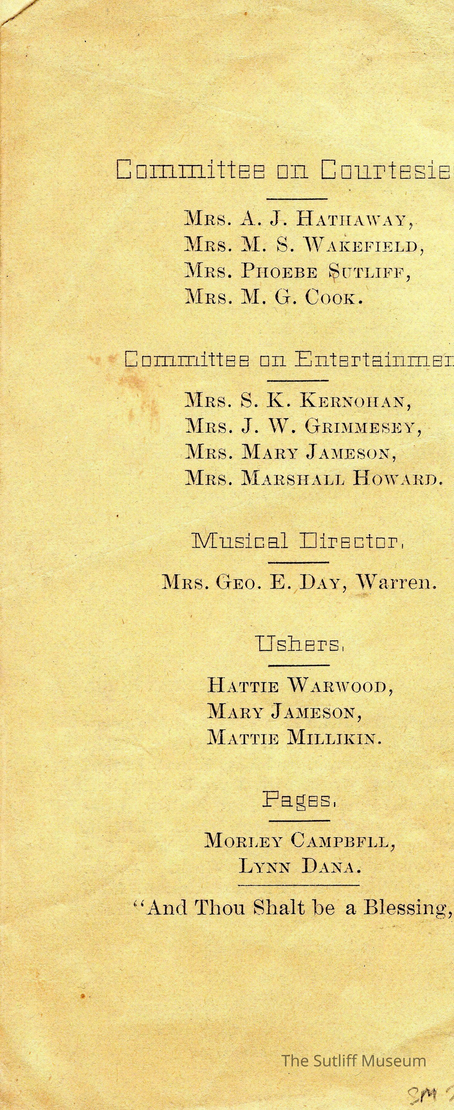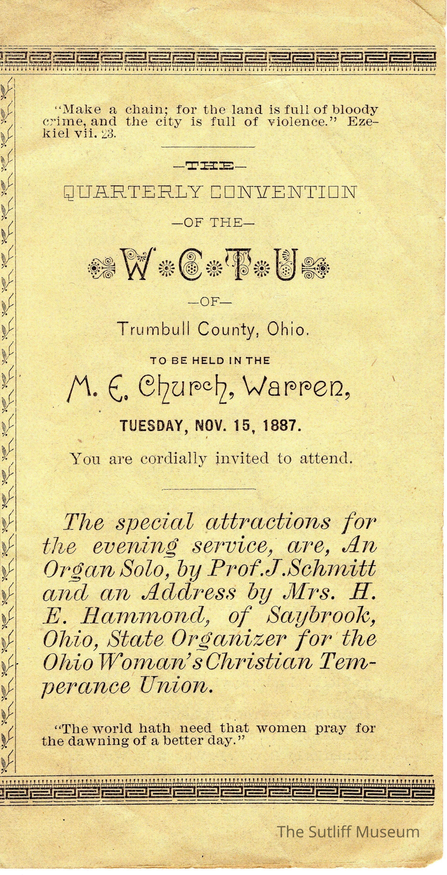 A program for the WCTU's Quarterly Convention to be held November 15, 1887.