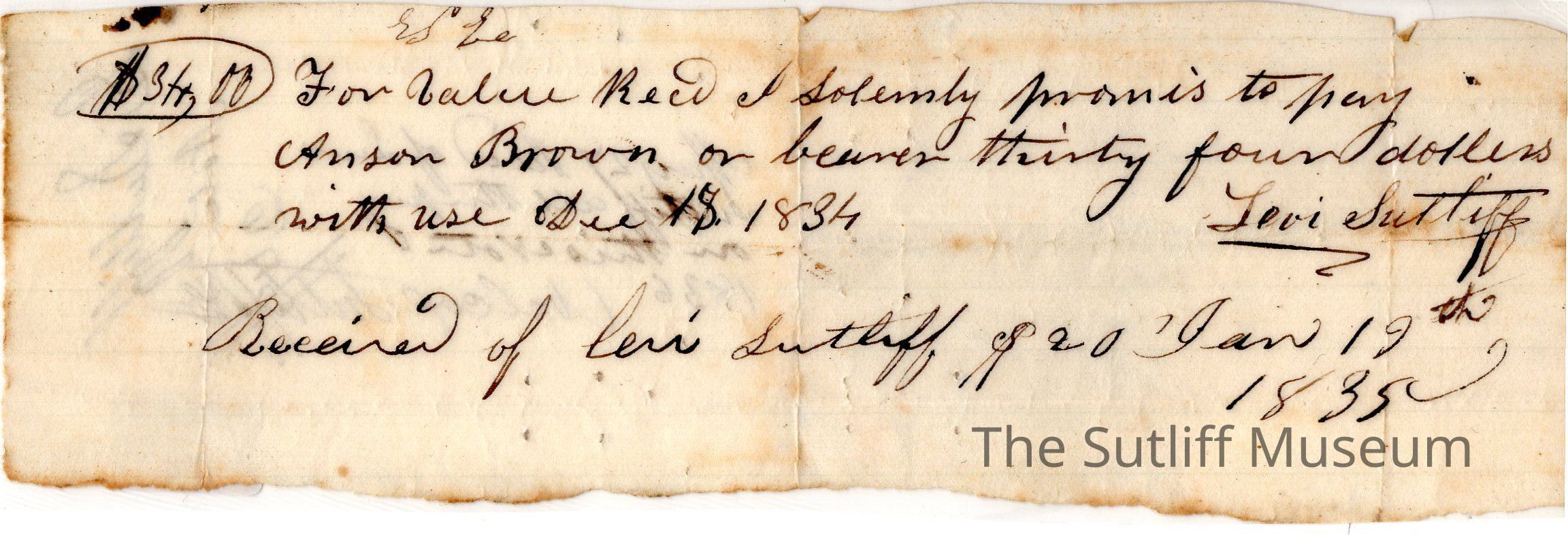Promise to pay from Wilcox Sutliff & Co to Anson Brown dated December 15, 1834