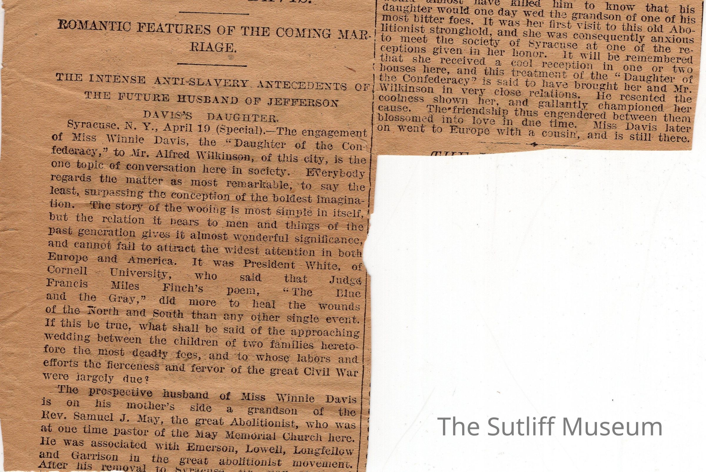 Newspaper clipping with an article titled "Wilkinson-Davis: Romantic Features of the Coming Marriage"Collection